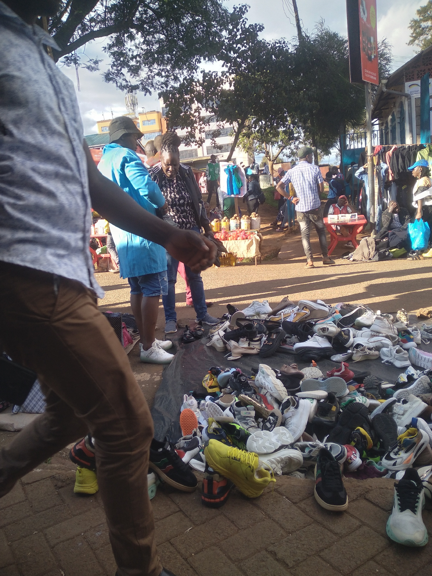 The image captures a bustling street scene in Nyeri, Kenya. A large assortment of shoes are laid out for sale on a dark sheet. People are present: some seem to be browsing the merchandise, while other…read more