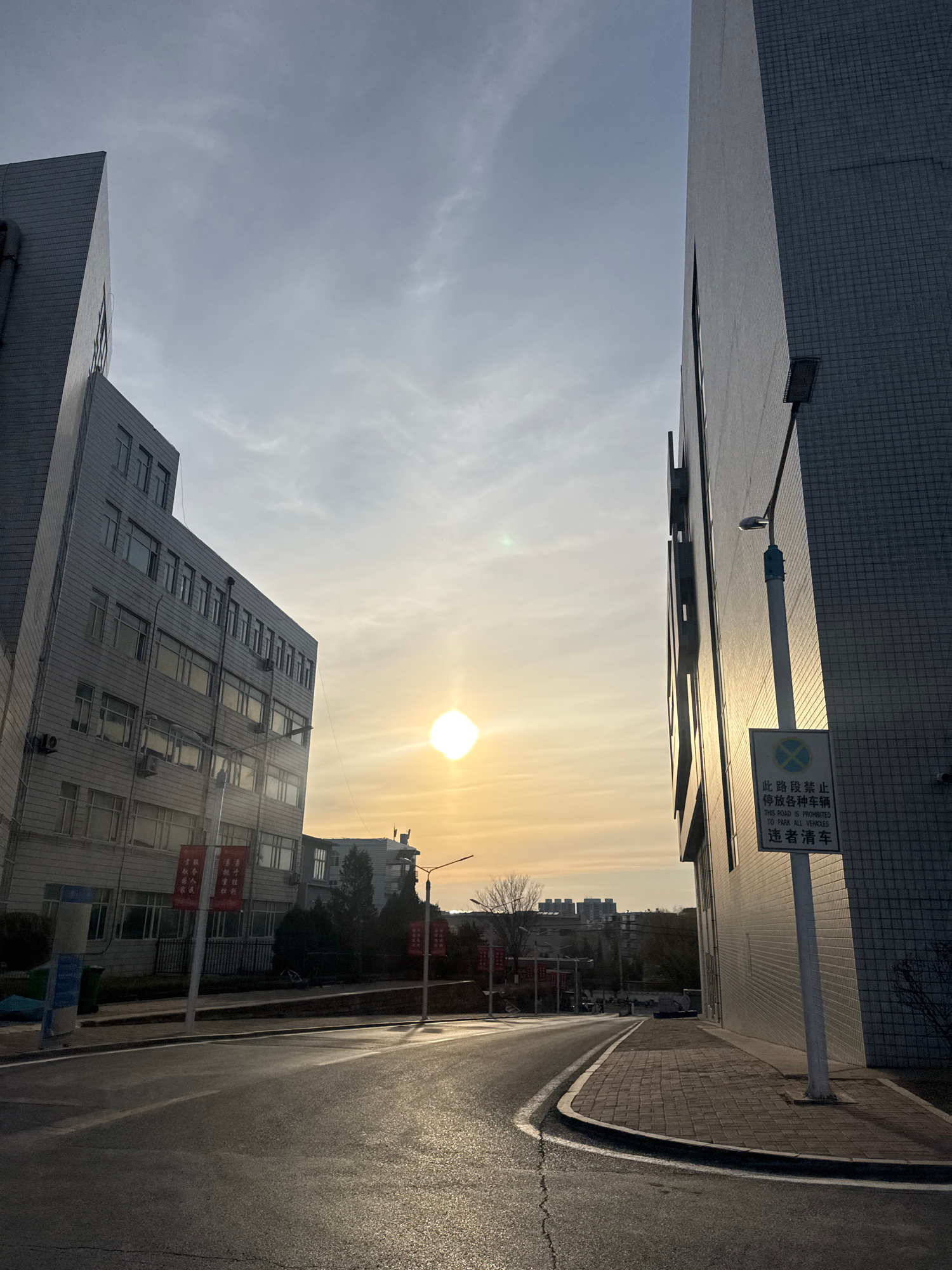 The image captures a street scene in Zhongtun, China at sunset. The sun is positioned centrally in the sky, creating a glare. Buildings flank either side of the street. A street sign in Chinese and En…read more