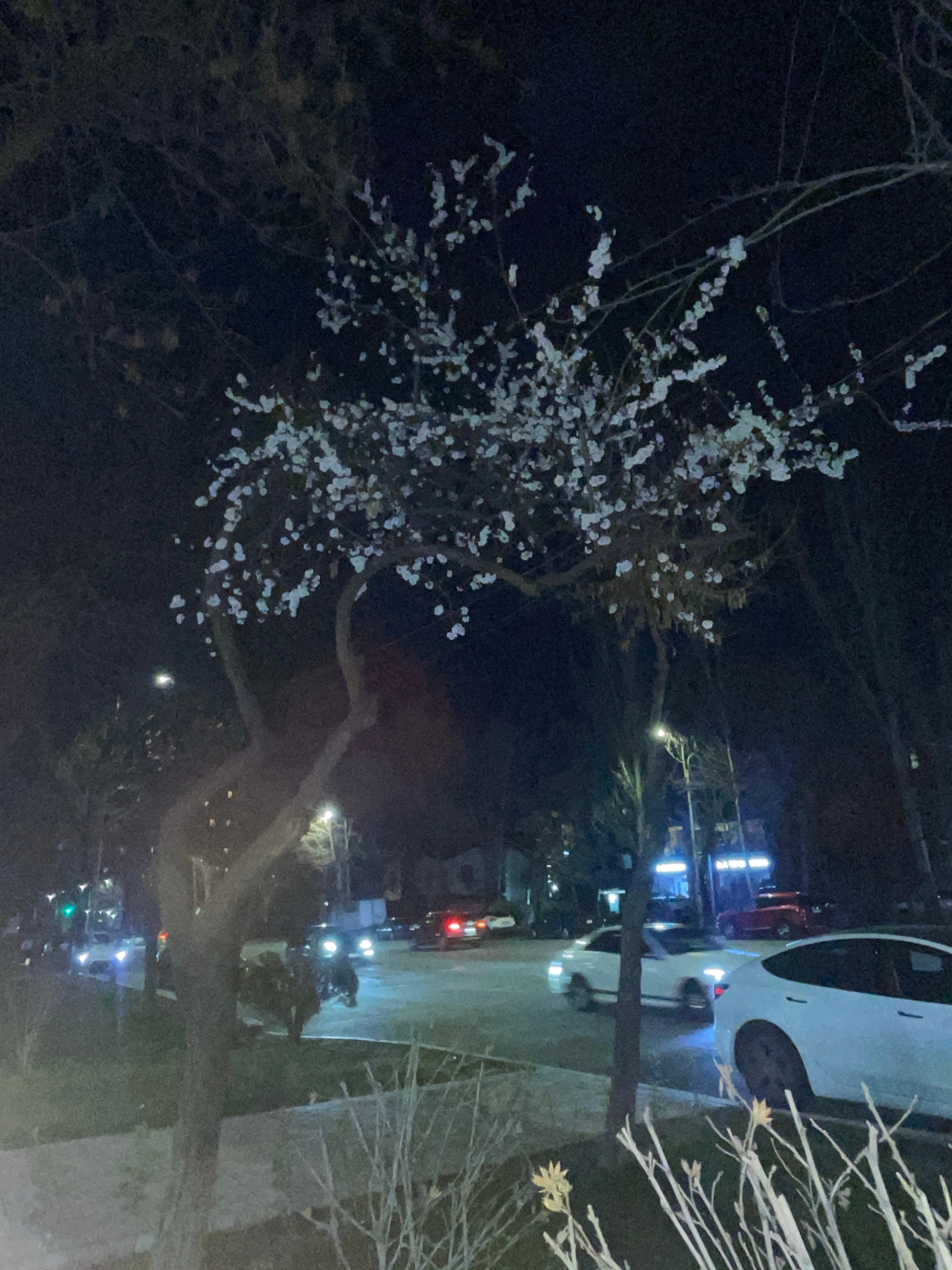 The image shows a night scene in Yerevan, Armenia. A blooming tree with white flowers is visible in the foreground on the left. In the background, a street scene with cars, including a white car parke…read more