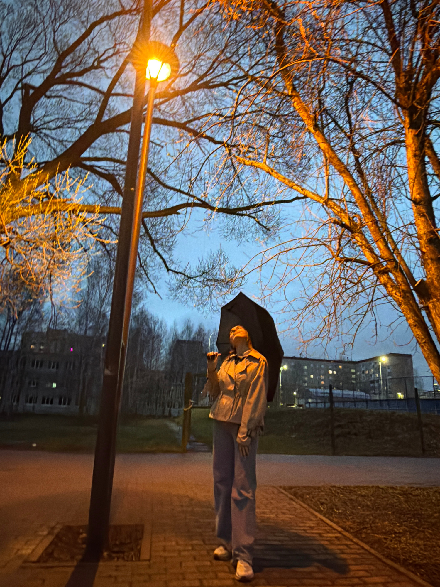 The image shows a person standing on a brick sidewalk in Izhevsk, Russia. The person is holding an open black umbrella. They are wearing a light-colored jacket and jeans. A lamppost with a lit light i…read more