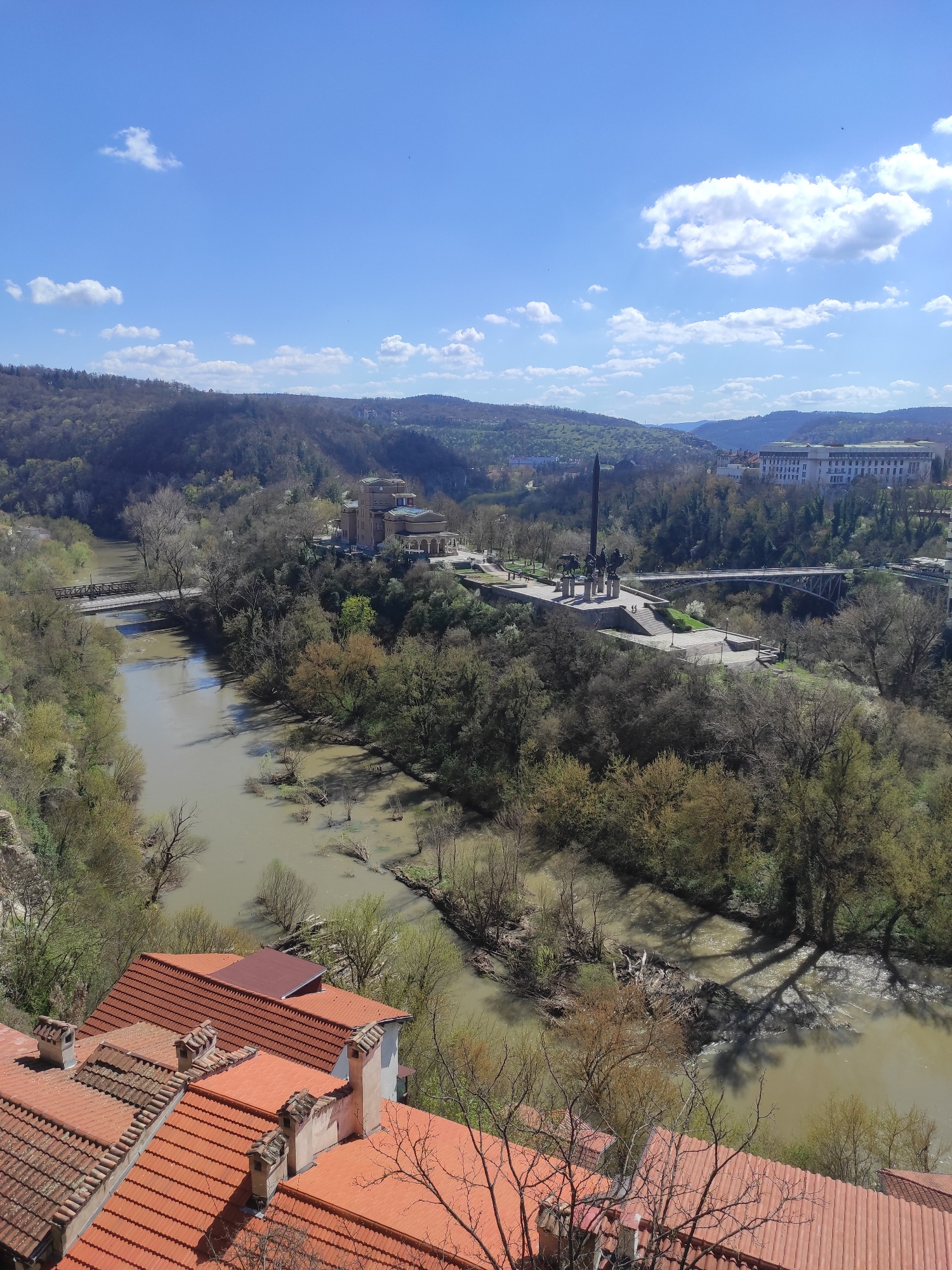 The image shows a landscape in Veliko Tarnovo, Bulgaria. A wide, muddy river flows through the scene, reflecting the sky. The riverbanks are lined with trees and vegetation, with some branches extendi…read more