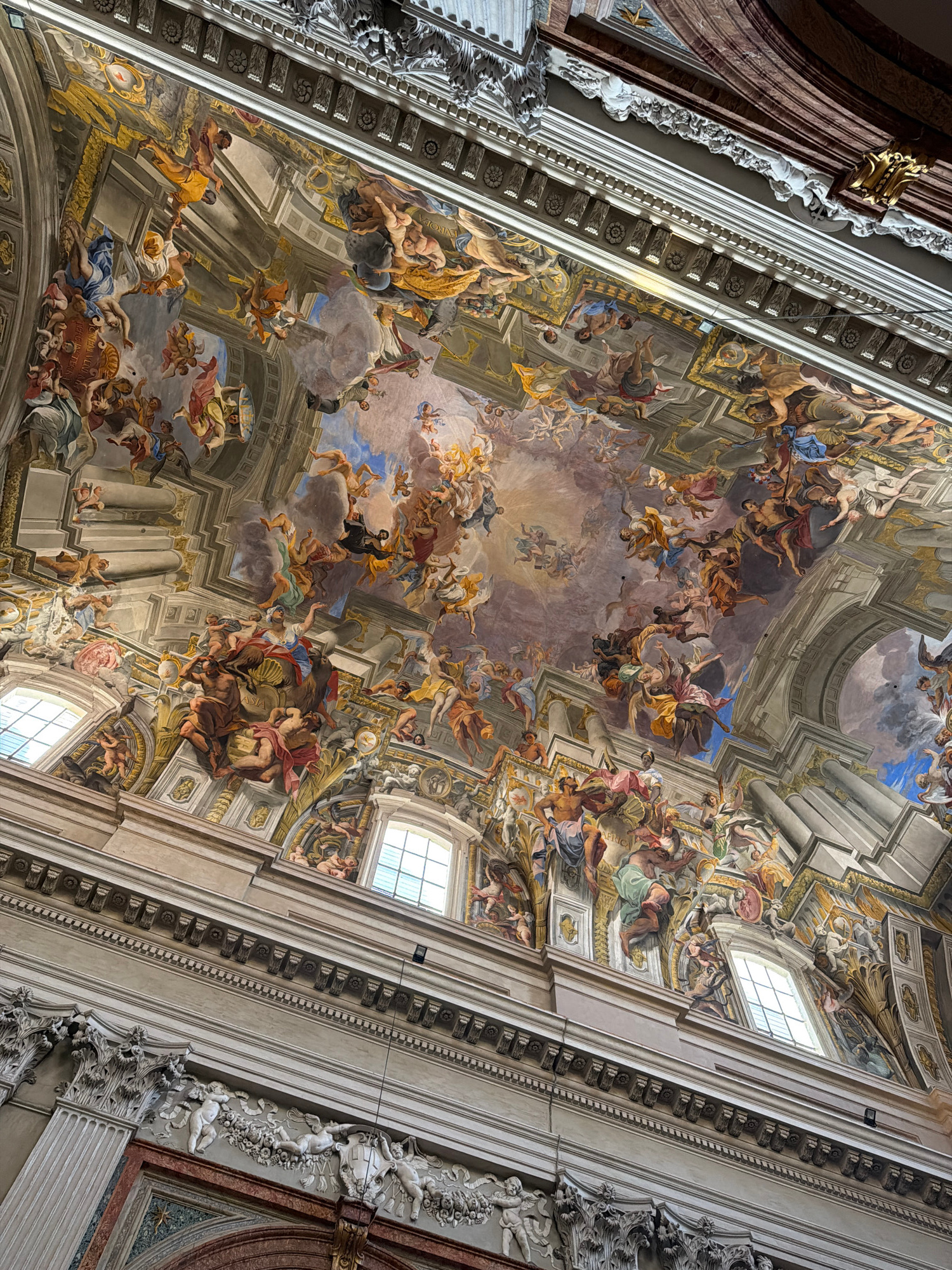 The image depicts the ceiling of the Church of Sant'Ignazio di Loyola in Campo Marzio, Rome, Italy. The ceiling is adorned with an elaborate Baroque fresco by Andrea Pozzo, titled "The Apotheosis of S…read more