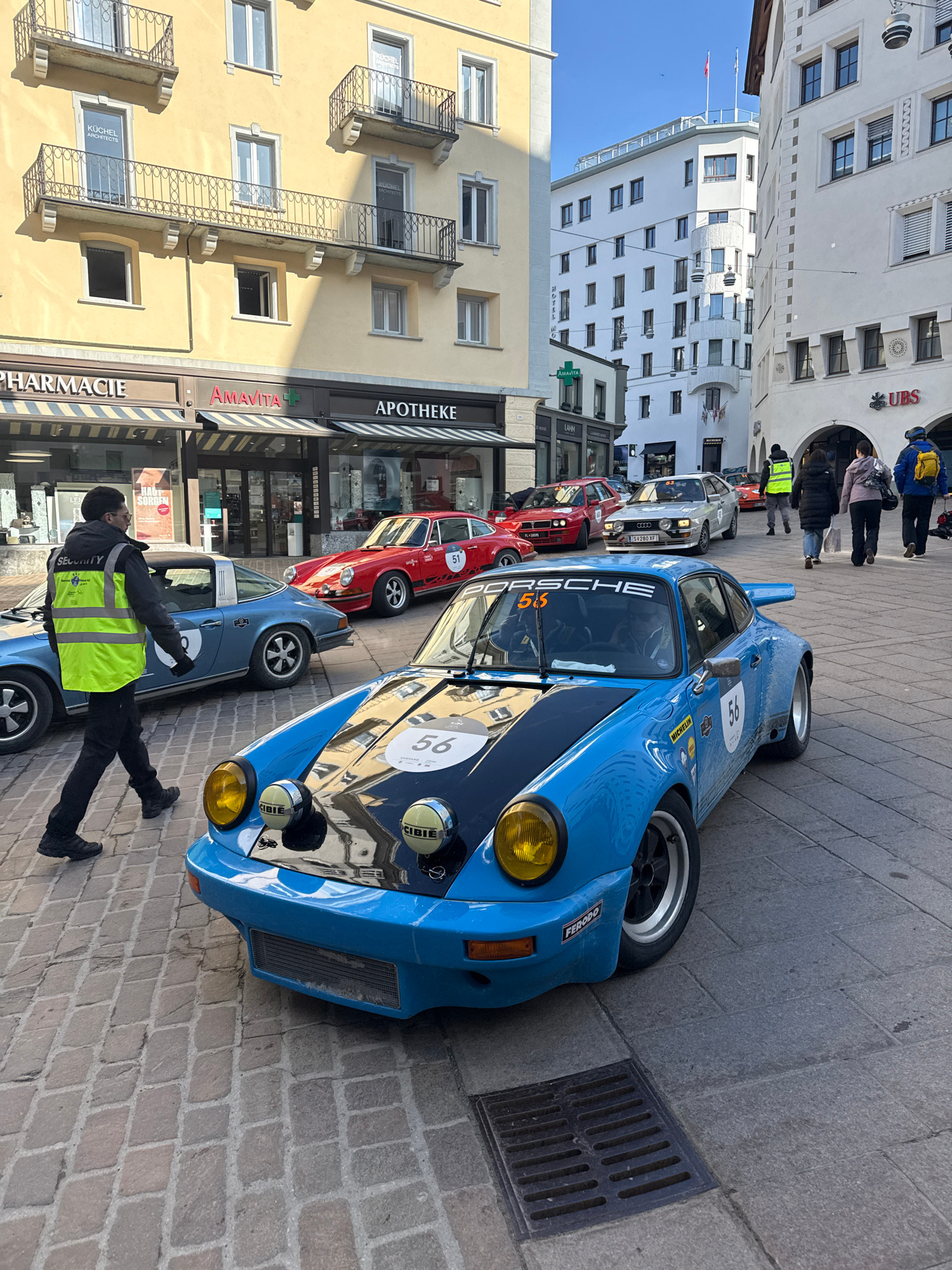 The scene depicts a vibrant street event in Sankt Moritz, Switzerland, specifically along Via Maistra, near its intersection with Plazza dal Mulin. The image is captured on a clear, sunny day, highlig…read more