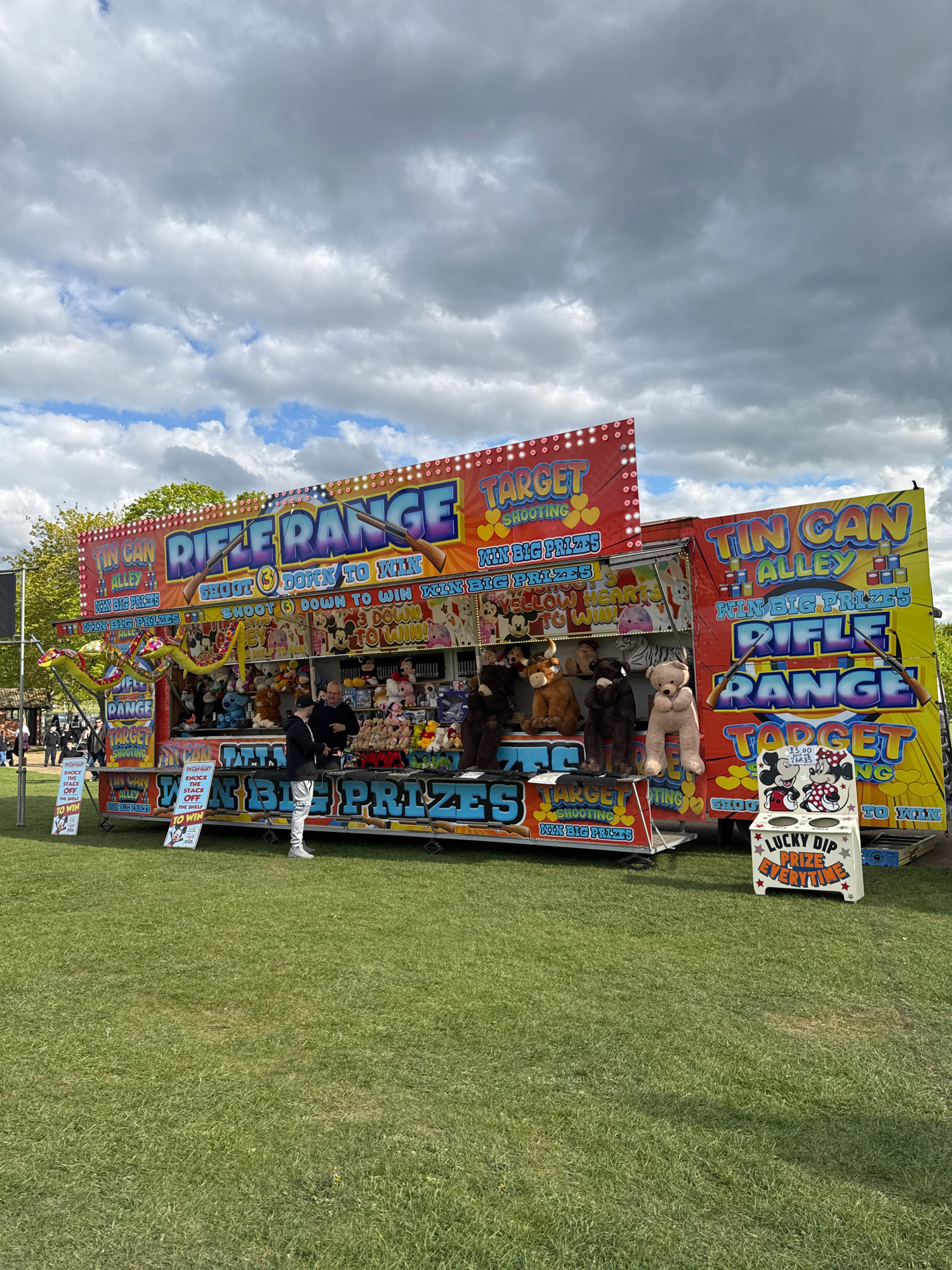 The image captures a mobile carnival game booth, offering a "Rifle Range" and "Tin Can Alley" game, set up on a grassy field under a cloudy sky. The booth is decorated with colorful signage advertisin…read more