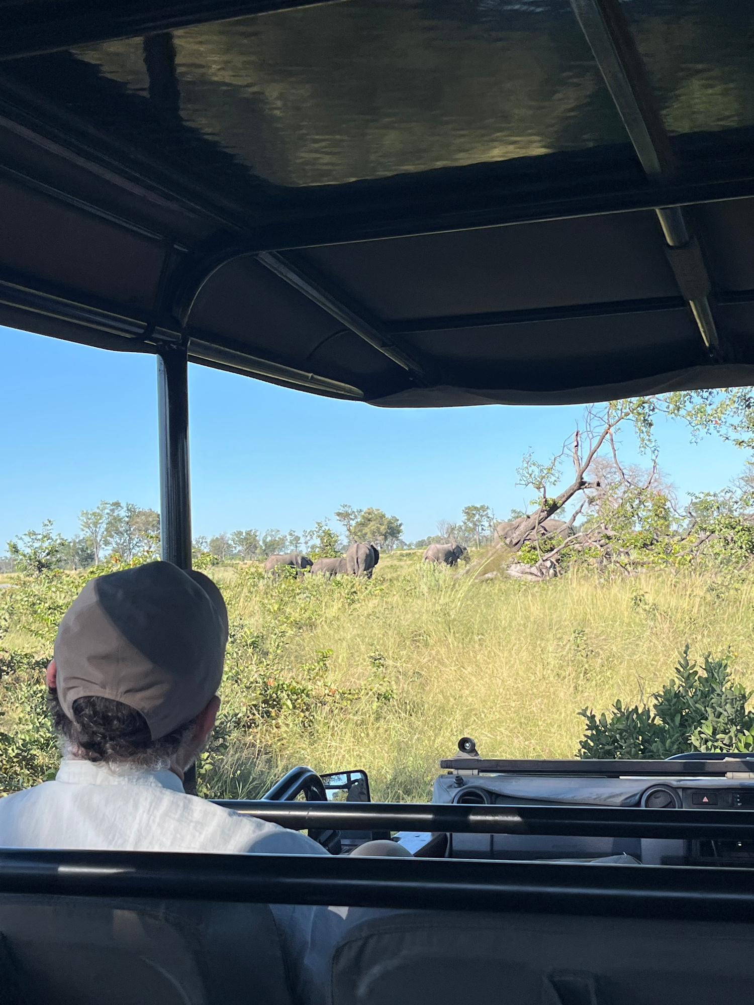 The image, taken from inside a safari vehicle, captures a view of the landscape in Khwai, Botswana. Through the vehicle's window, a grassy plain extends under a bright blue sky. A cluster of trees pun…read more