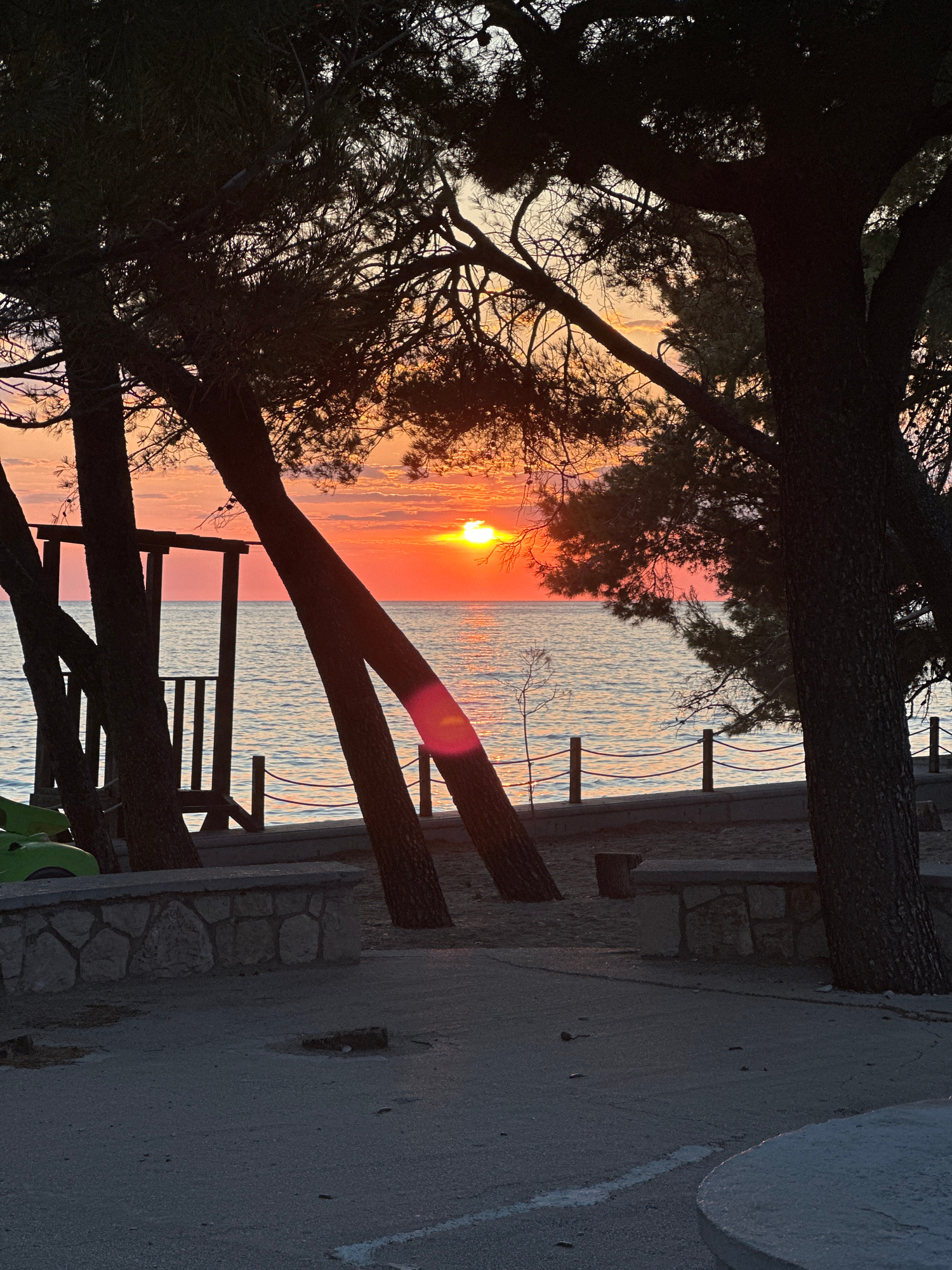 This image captures a serene coastal sunset, likely in Šušanj, Montenegro, framed by the dark silhouettes of numerous pine trees. The setting sun, a brilliant orange sphere, is positioned low on the h…read more