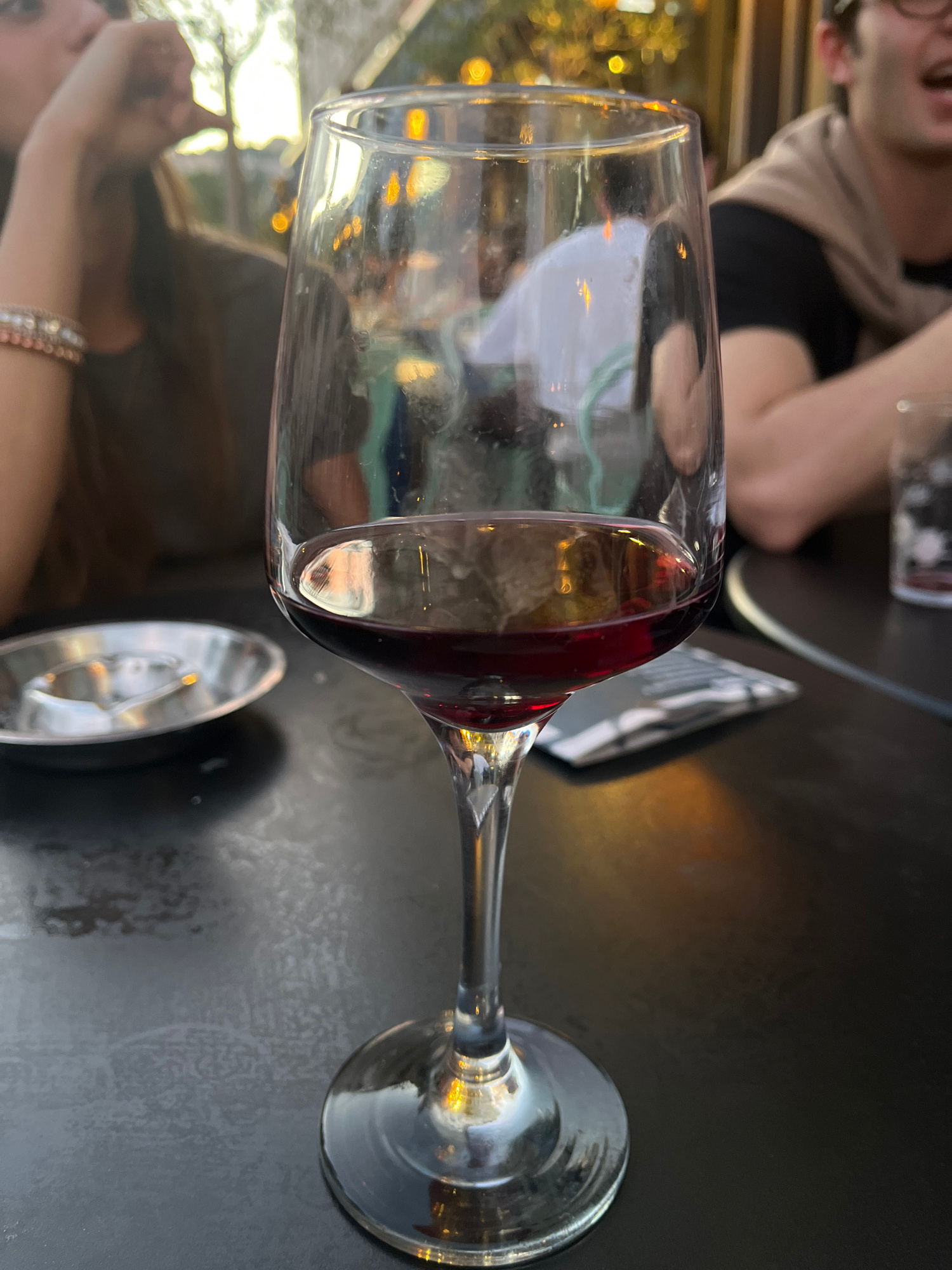 A medium shot, rotated clockwise, features a wine glass partially filled with red wine on a black table. The base of the glass is to the right. A small, round, metal ashtray sits near the glass. A men…read more
