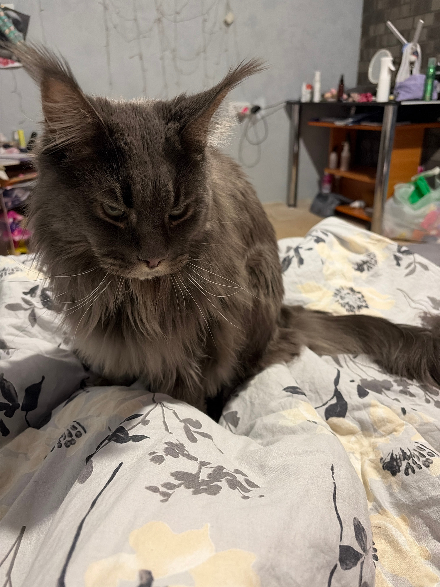 A gray Maine Coon cat is lying on a bed with a floral patterned duvet cover. The cat is positioned diagonally across the frame, with its head closer to the left edge and its tail extending towards the…read more