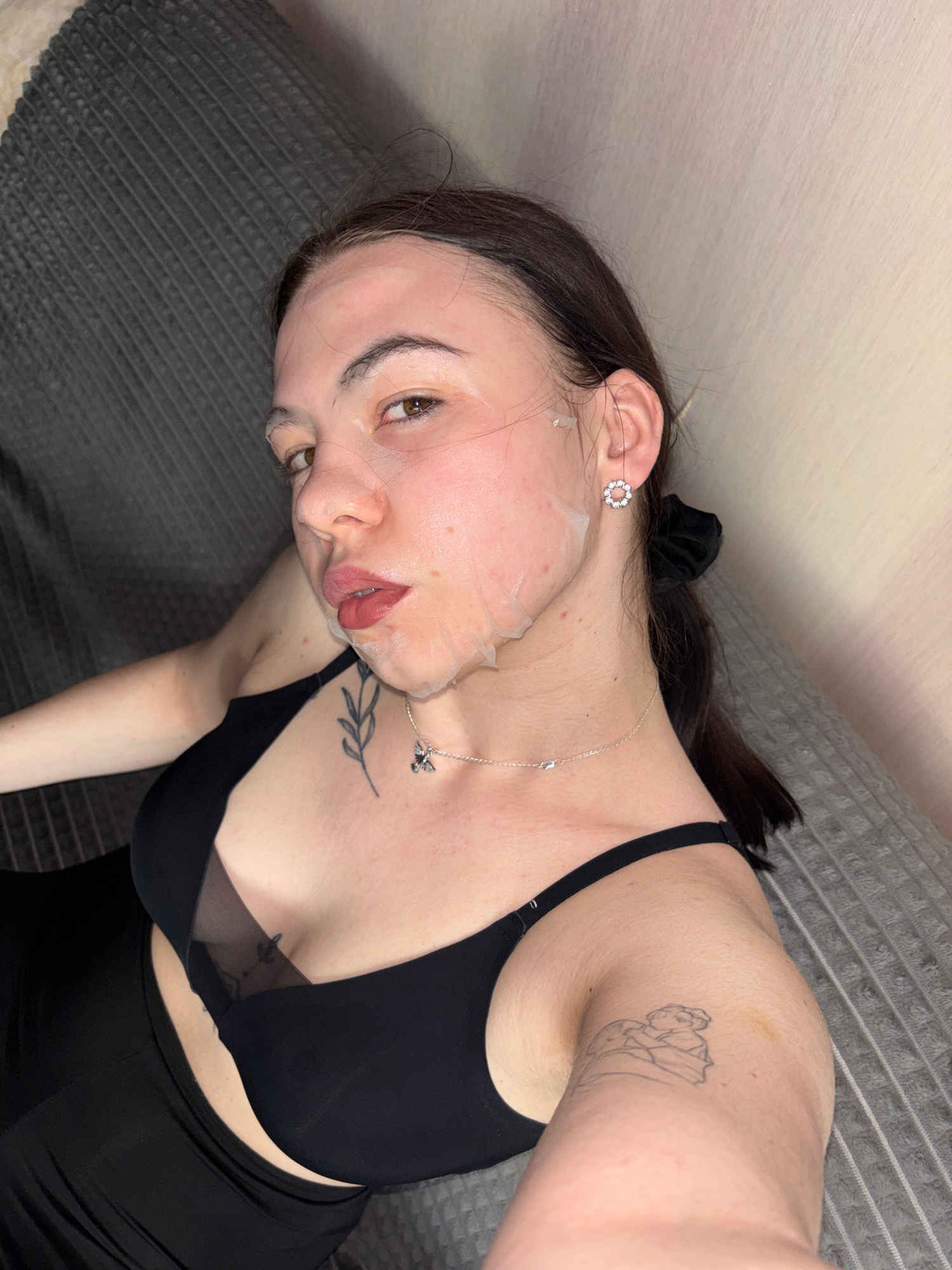 A woman is shown indoors. She is wearing a black bra and dress and has a face mask on. She also has earrings, a necklace, and tattoos. The environment includes a couch. There is no information to iden…read more