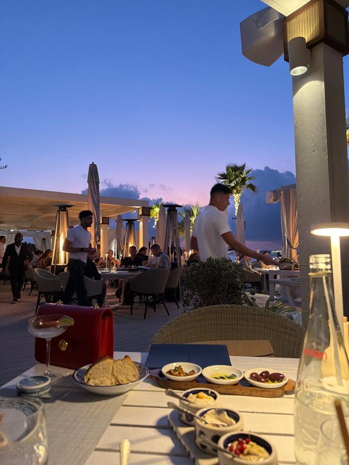 The image depicts an outdoor dining establishment during twilight, likely a high-end restaurant or beach club located in Dubai, United Arab Emirates. The foreground features a white slatted table set…read more