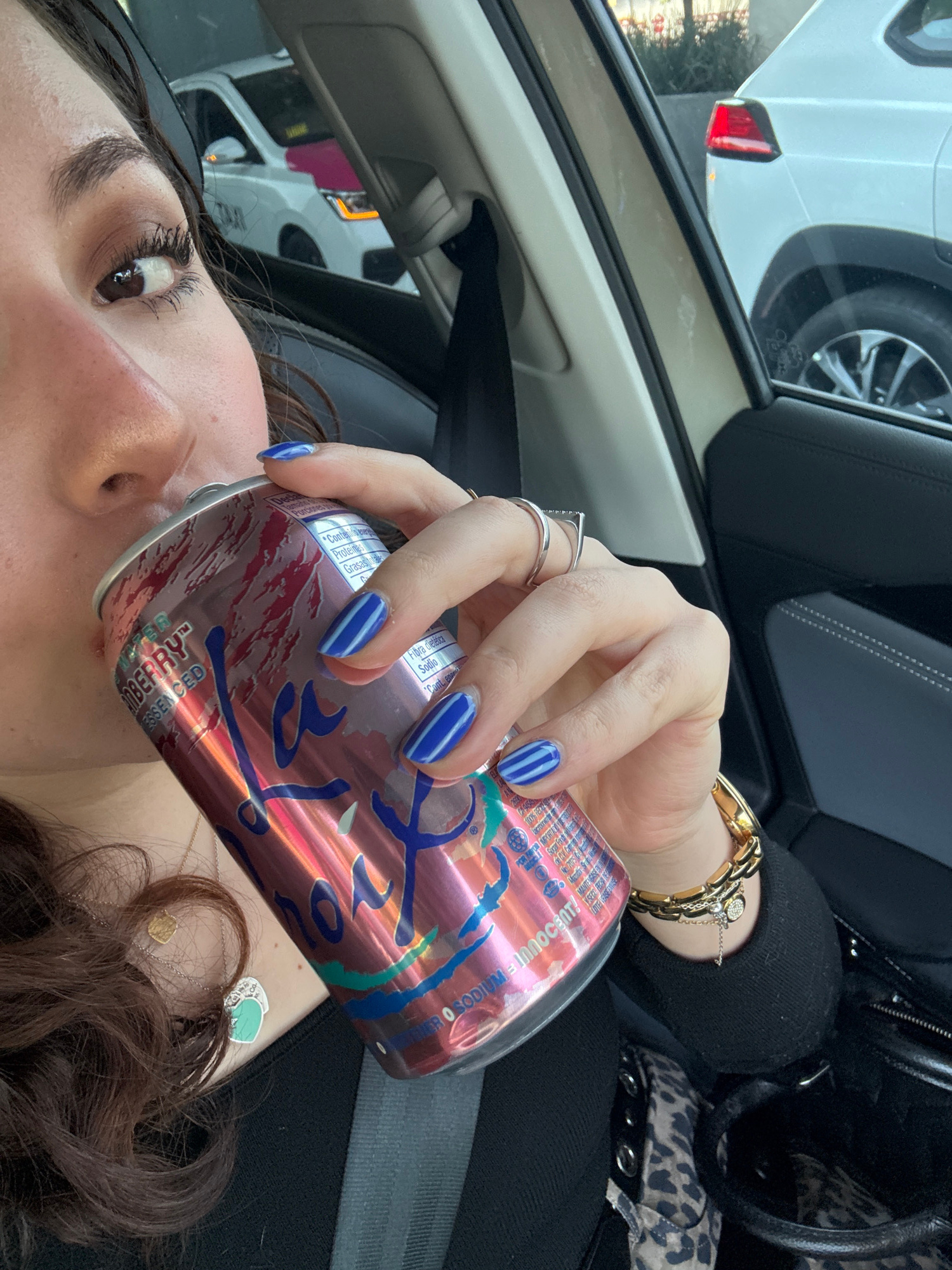 The image shows a person drinking from a can of La Croix. The person is in a car and appears to be in Mexico City, Mexico, as suggested by the can's Spanish language labeling. They are wearing a blackβ¦read more