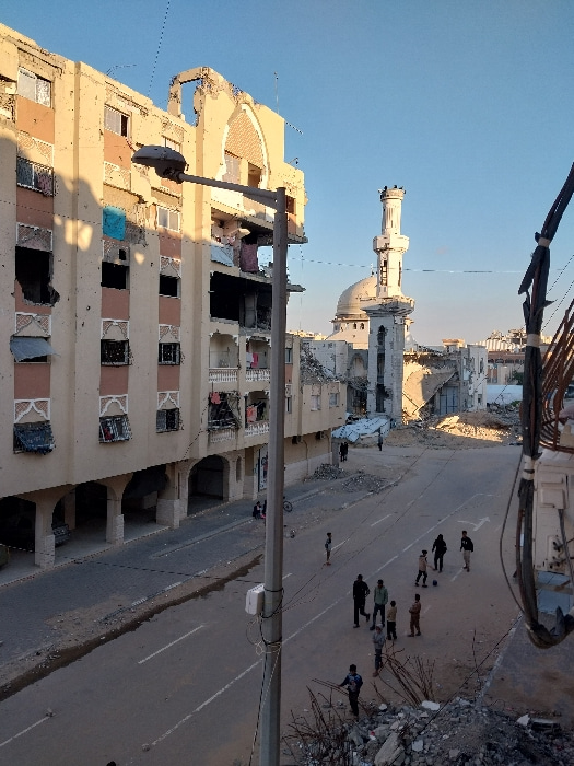 The image depicts a street scene in Khan Yunis, Palestinian Territory, characterized by significant structural damage. In the foreground and left, a multi-story, cream-colored residential building exh…read more