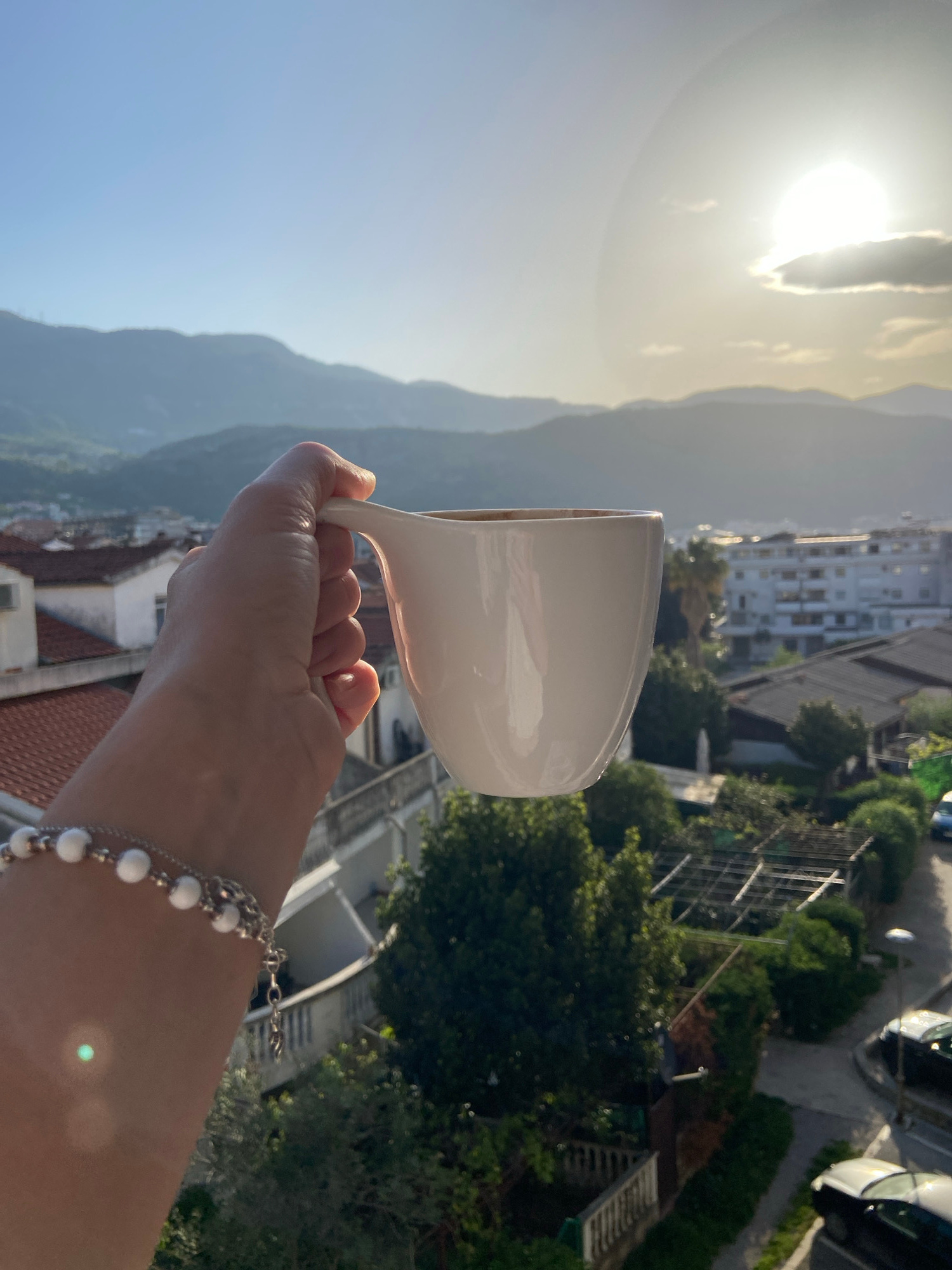 This image features a close-up view of a person's hand holding a white cup with a subtle golden rim, set against a breathtaking panoramic landscape. The hand, adorned with a delicate white beaded and…read more
