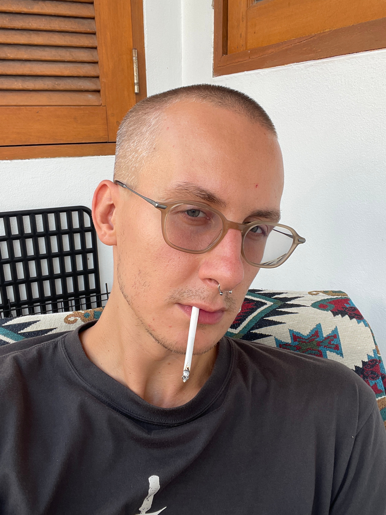 A light-skinned male with a shaved head is photographed from a medium-angle, resting on an ethnic-patterned cushion. He is wearing eyeglasses with thin frames and a nose ring, and he has a lit cigaret…read more