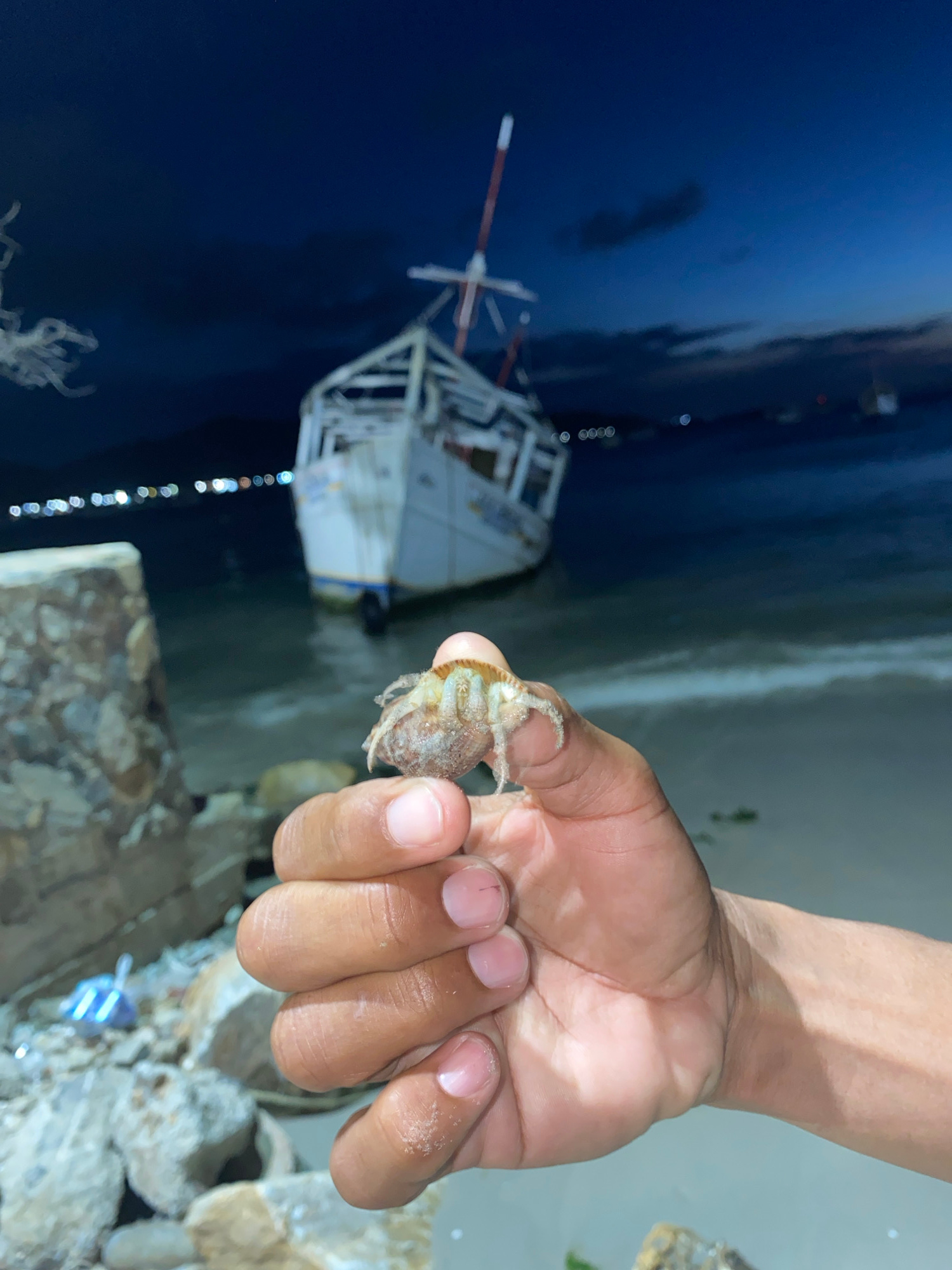 A person's hand holds a hermit crab in its shell, possibly on a dock or beach. In the background, out of focus, is a small boat anchored in the dark water of the bay. The lighting suggests it is eithe…read more