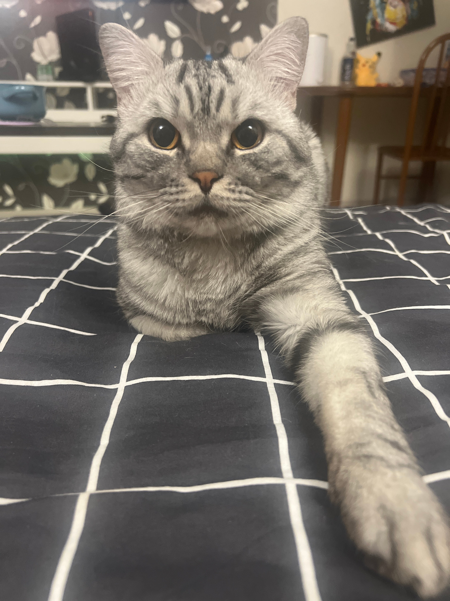 A gray tabby cat lies on a black and white checkered surface. The cat is positioned diagonally in the frame with its head near the lower left corner and its extended front paw towards the upper right…read more