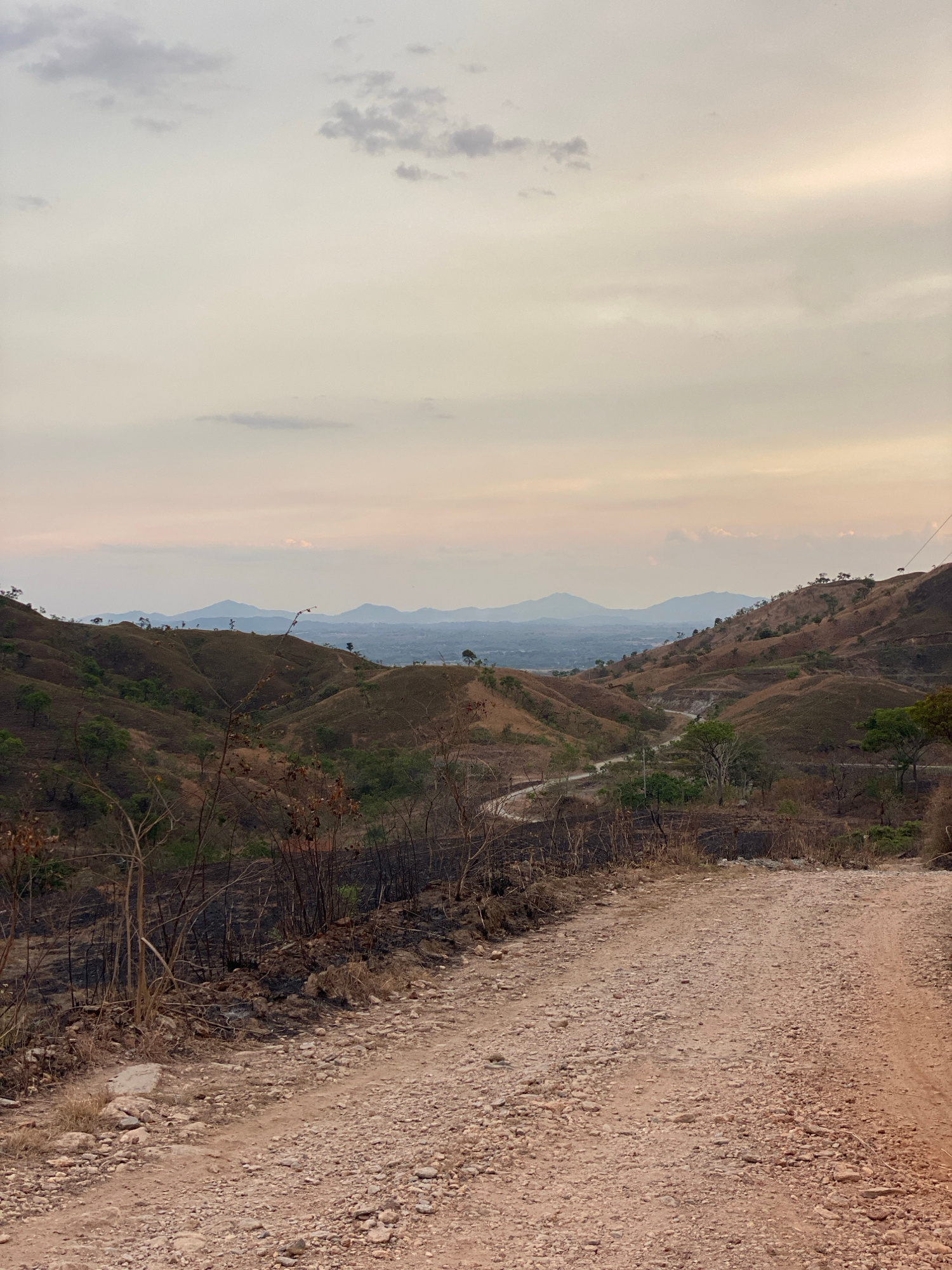 The image shows a landscape in Tinaquillo, Venezuela. A dirt road runs along the right side of the frame. Adjacent to the road, the terrain slopes down into a valley. The vegetation appears to be spar…read more