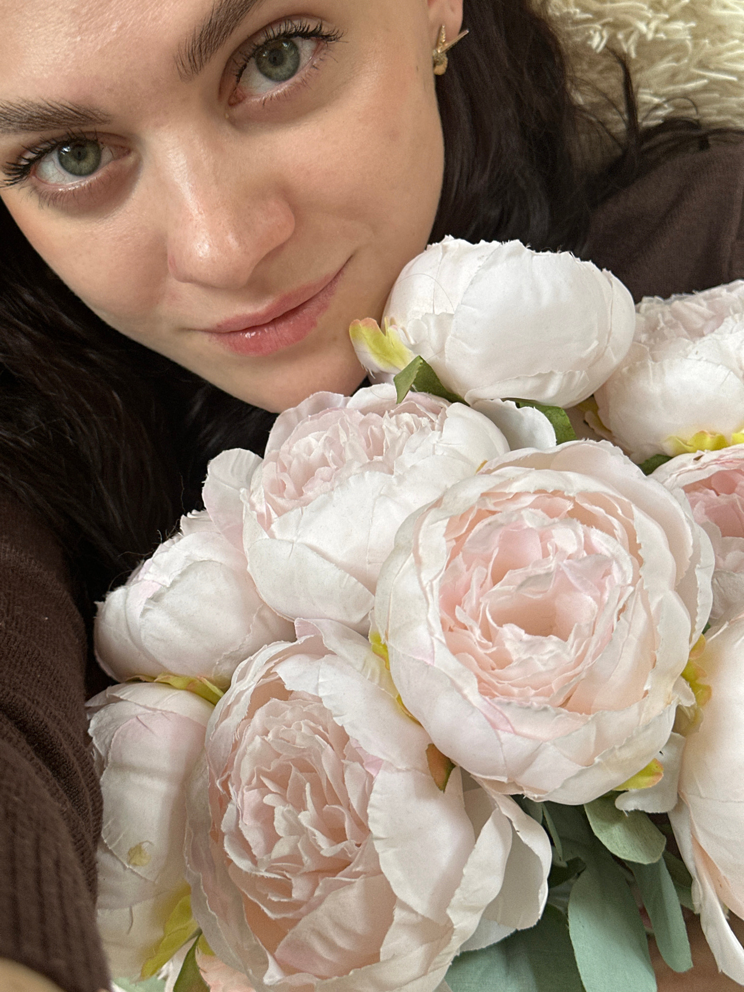 A woman lies on her back with a bouquet of light pink and white peonies obscuring the upper right portion of the frame. She has fair skin, dark brown hair, and green eyes. Her lips appear glossy. A sm…read more