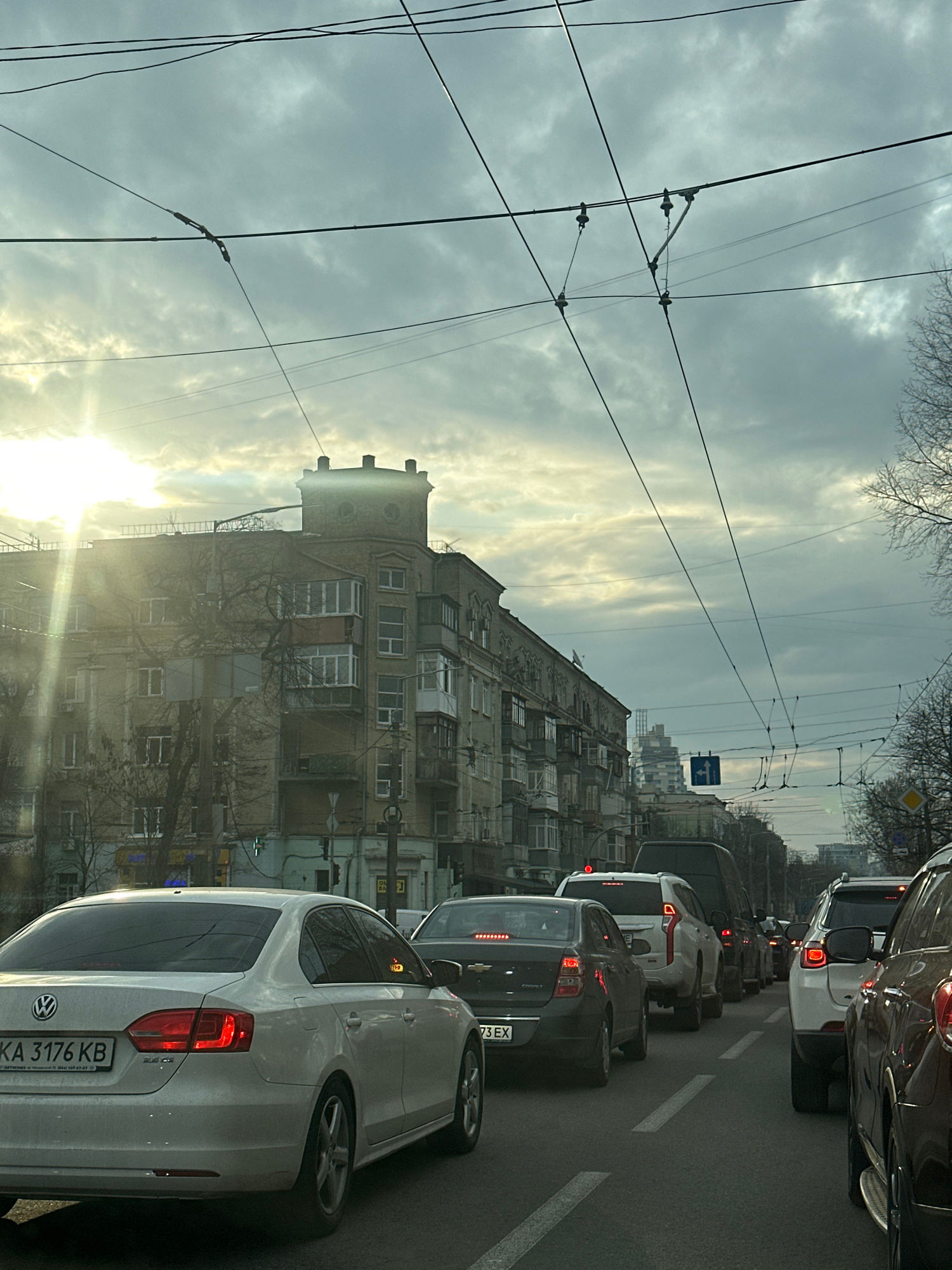 The image shows a traffic jam on a street in Kyiv, Ukraine. The street is lined with buildings, including an older residential building with a distinctive tower. Overhead are trolleybus wires. The sky…read more