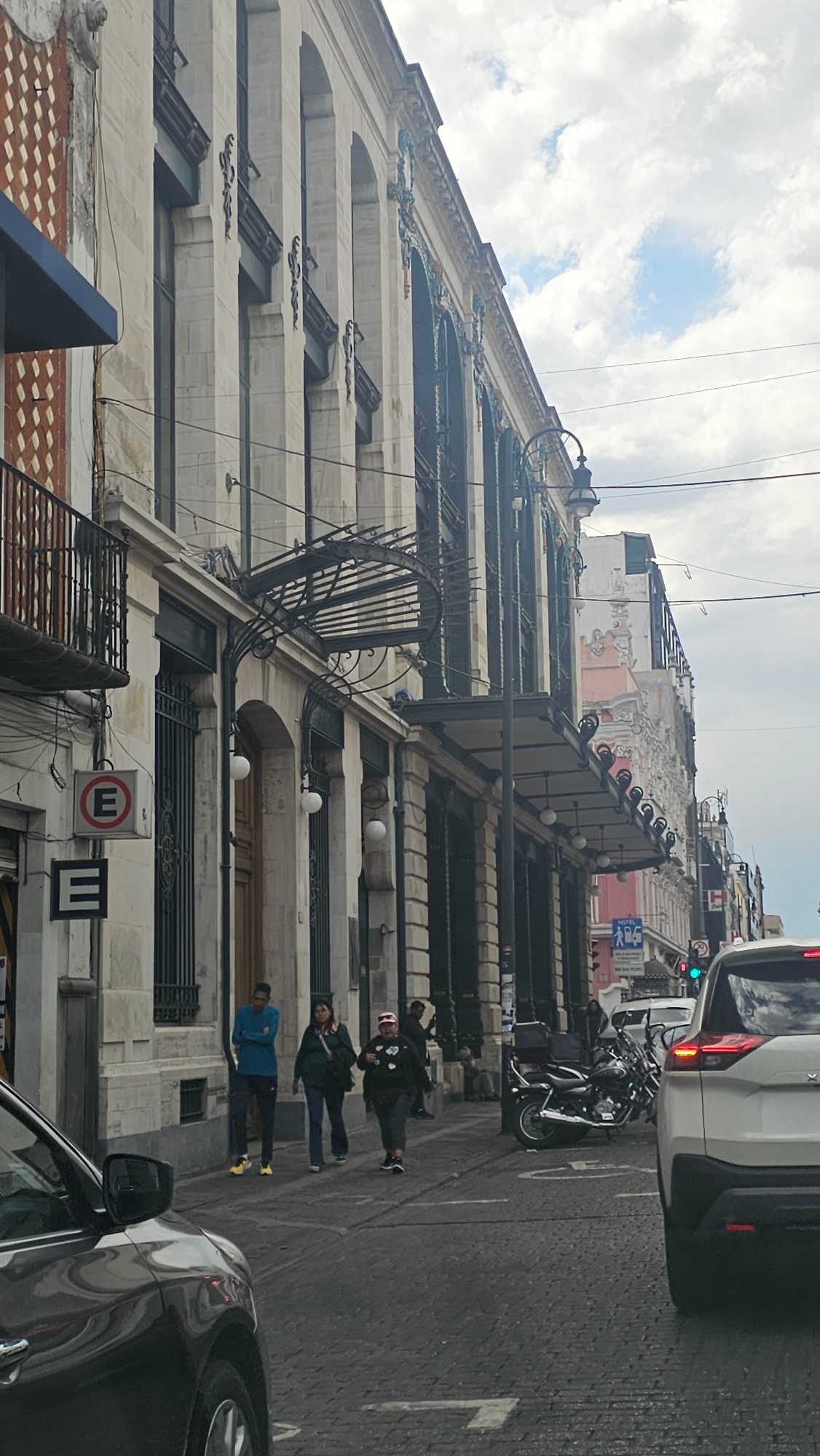 The scene depicts a street view in Puebla, Mexico. A tall building with a white facade and intricate architectural details dominates the left side of the frame. Several floors are visible, each featurβ¦read more