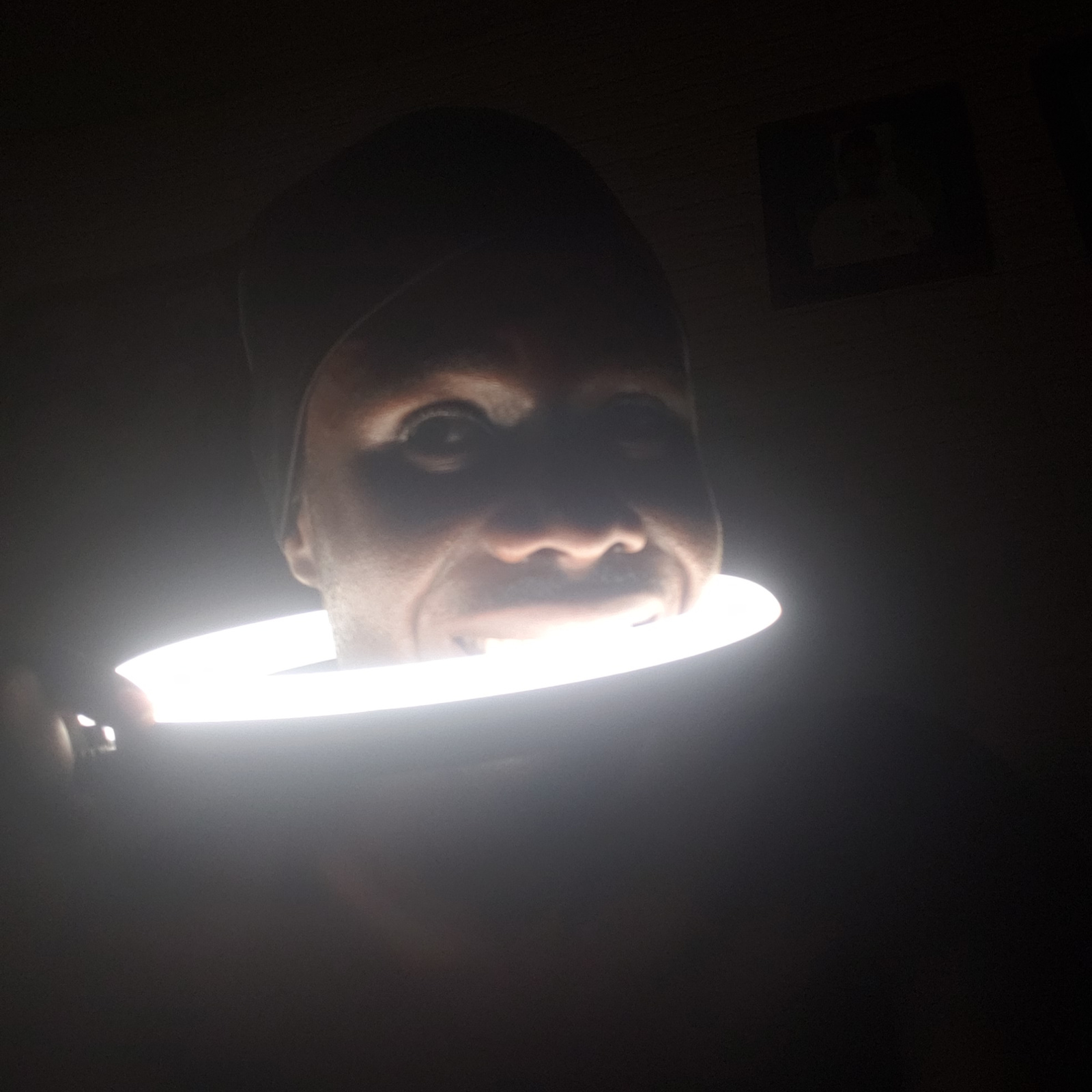 A close-up, low-angle photograph in low light shows a person's face partially illuminated by a bright, circular light source, possibly a ring light. The person's face is tilted, with their nose, mouth…read more