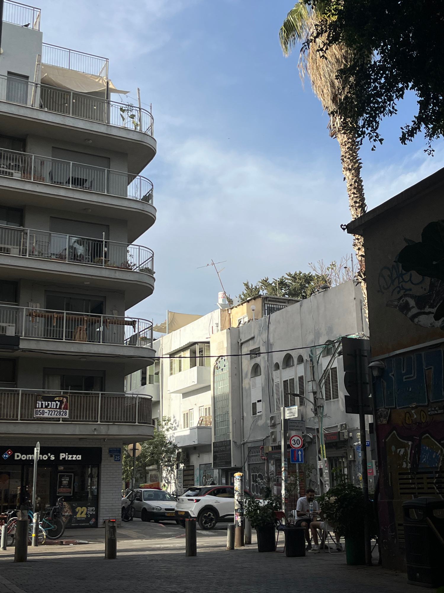 The image depicts a street view in Tel Aviv, Israel. The buildings are a mix of modern and older styles, with white or gray facades. A curved building with balconies is visible on the lower left. Ther…read more