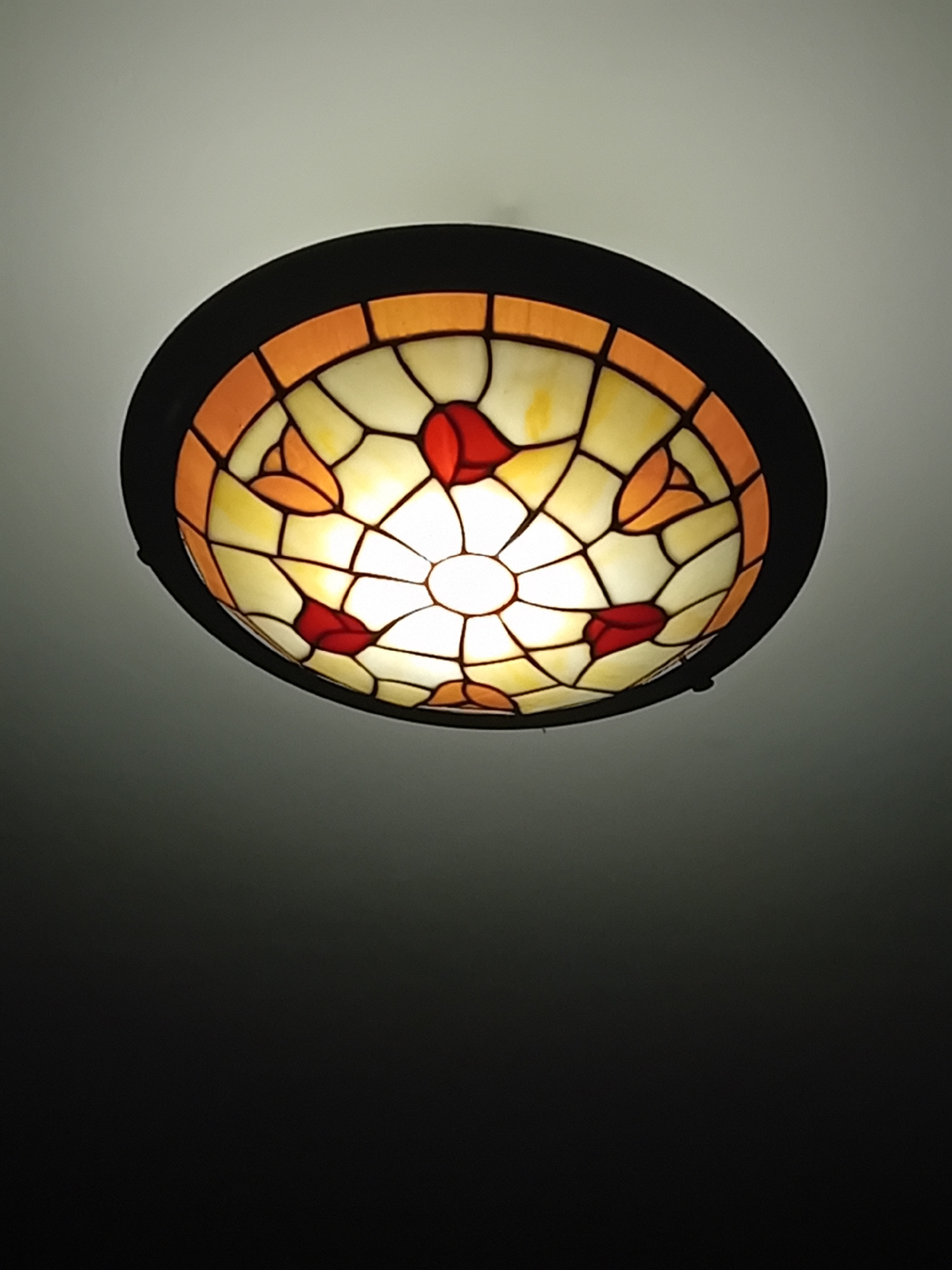 The image depicts a round, stained-glass ceiling light fixture. The fixture has a black circular frame with a design consisting of yellow, orange, and red stained-glass pieces. The glass is arranged i…read more