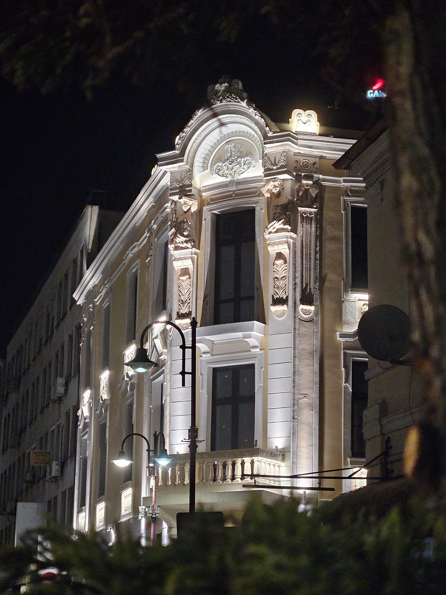 At night, the camera looks up at an ornate building facade in Burgas, Bulgaria. The building is lit with streetlights and has architectural details like columns, moldings, and decorative elements. A sā¦read more