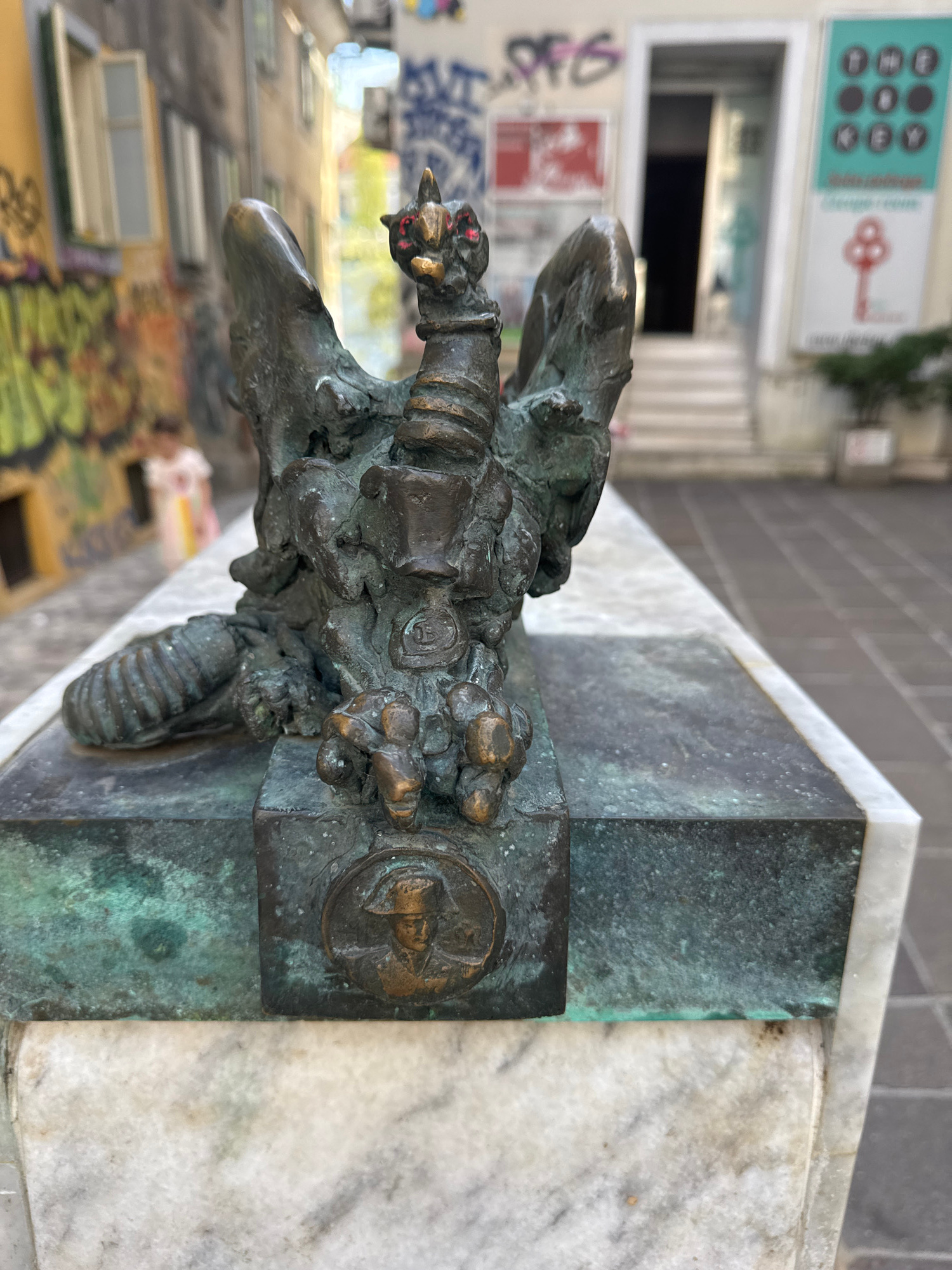 A bronze dragon statue sits atop a stone pedestal. The dragon has open wings and a menacing expression with red accents on its snout. The pedestal is made of a dark, possibly verdigris-covered materia…read more