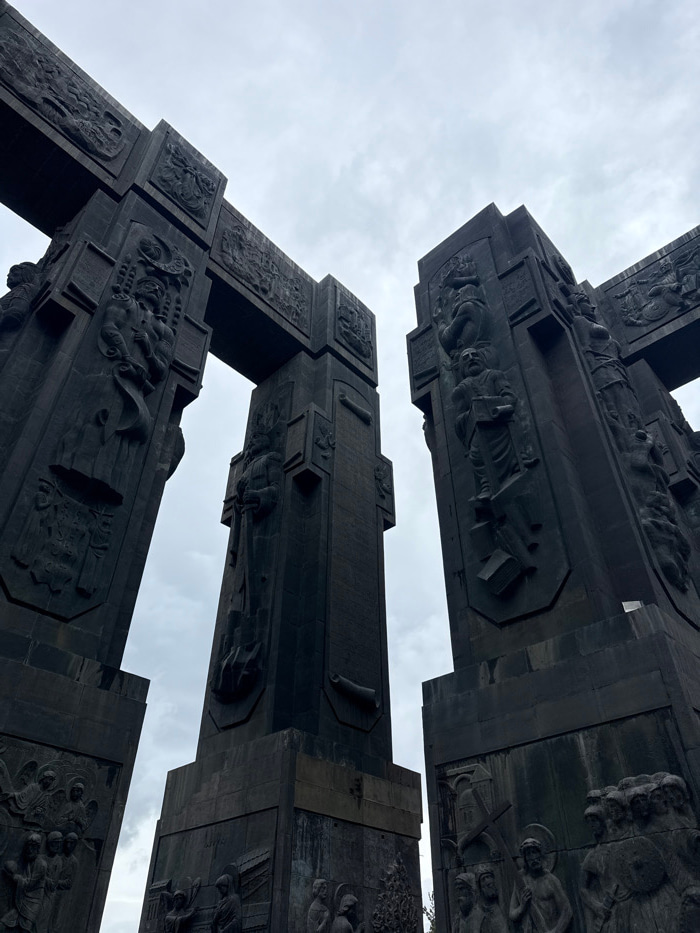 The image displays a low-angle perspective of the Chronicle of Georgia (also known as the History Memorial of Georgia), located on a hill overlooking the Tbilisi Sea in Tbilisi, Georgia. The scene fea…read more