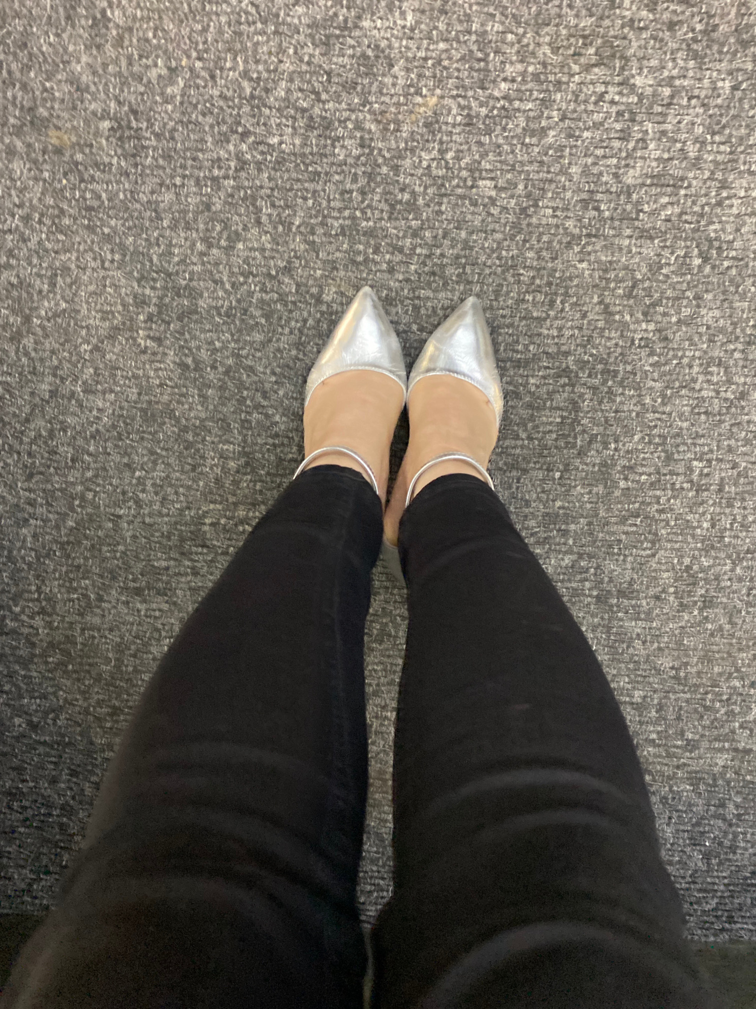 The image shows a person's legs from a top-down perspective, wearing black skinny jeans and silver pointed-toe flats. The person is standing on a gray carpet with a textured pattern. No information su…read more