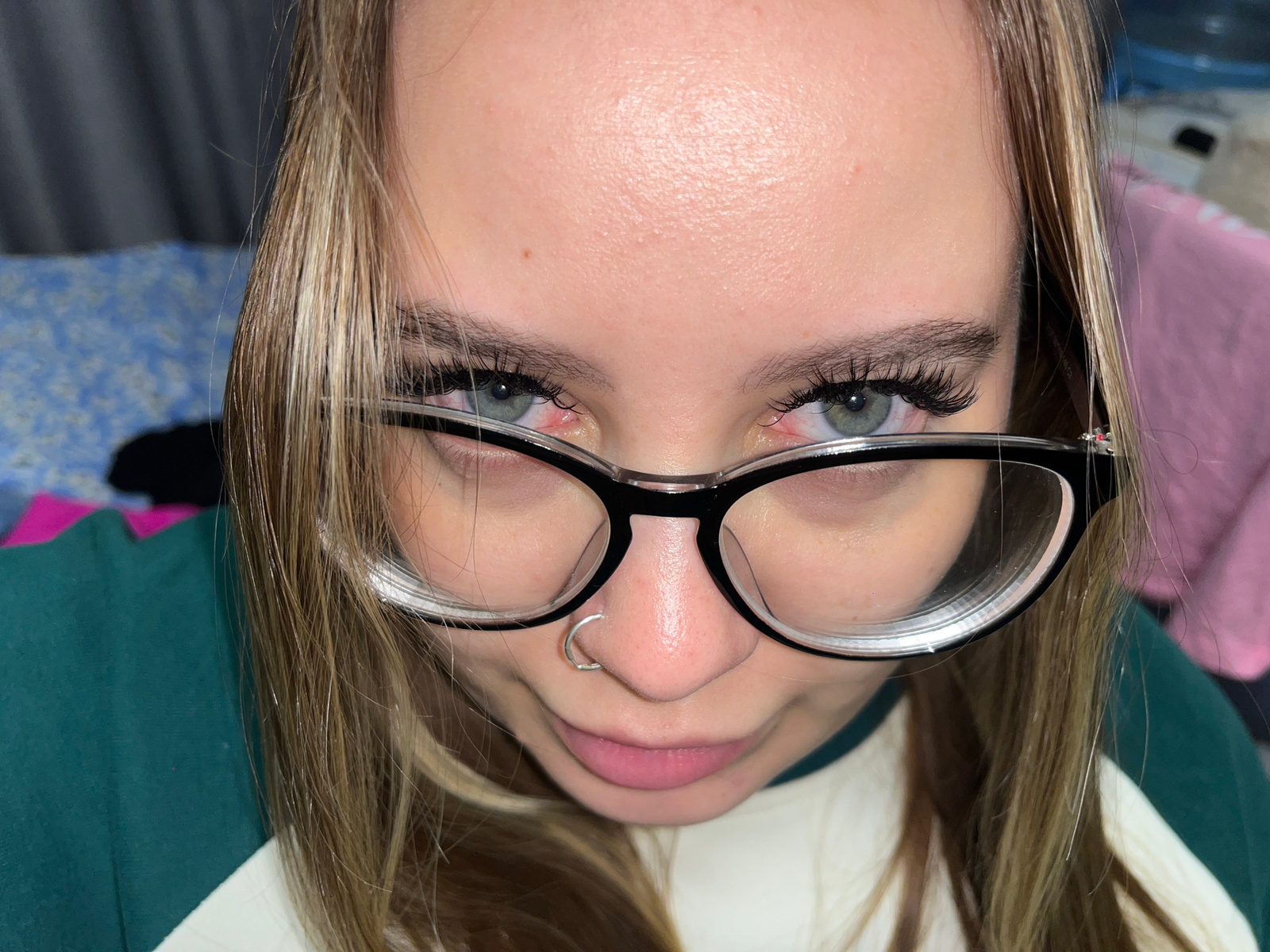 A close-up, inverted portrait depicts a person with fair skin, light brown hair, and green eyes. The person is wearing glasses with a black frame and clear lenses. A silver nose ring is visible on the…read more