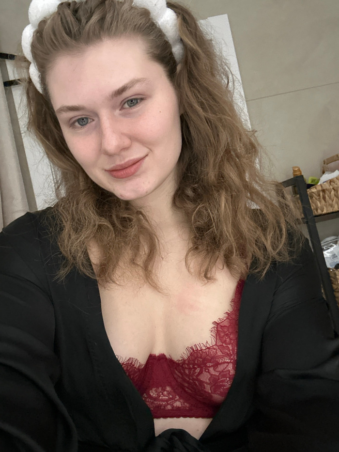 A woman lies on her side, gazing at the camera. She has wavy brown hair, fair skin, and blue eyes. A white spa headband sits atop her head. She is wearing a black robe open to reveal a burgundy lace b…read more