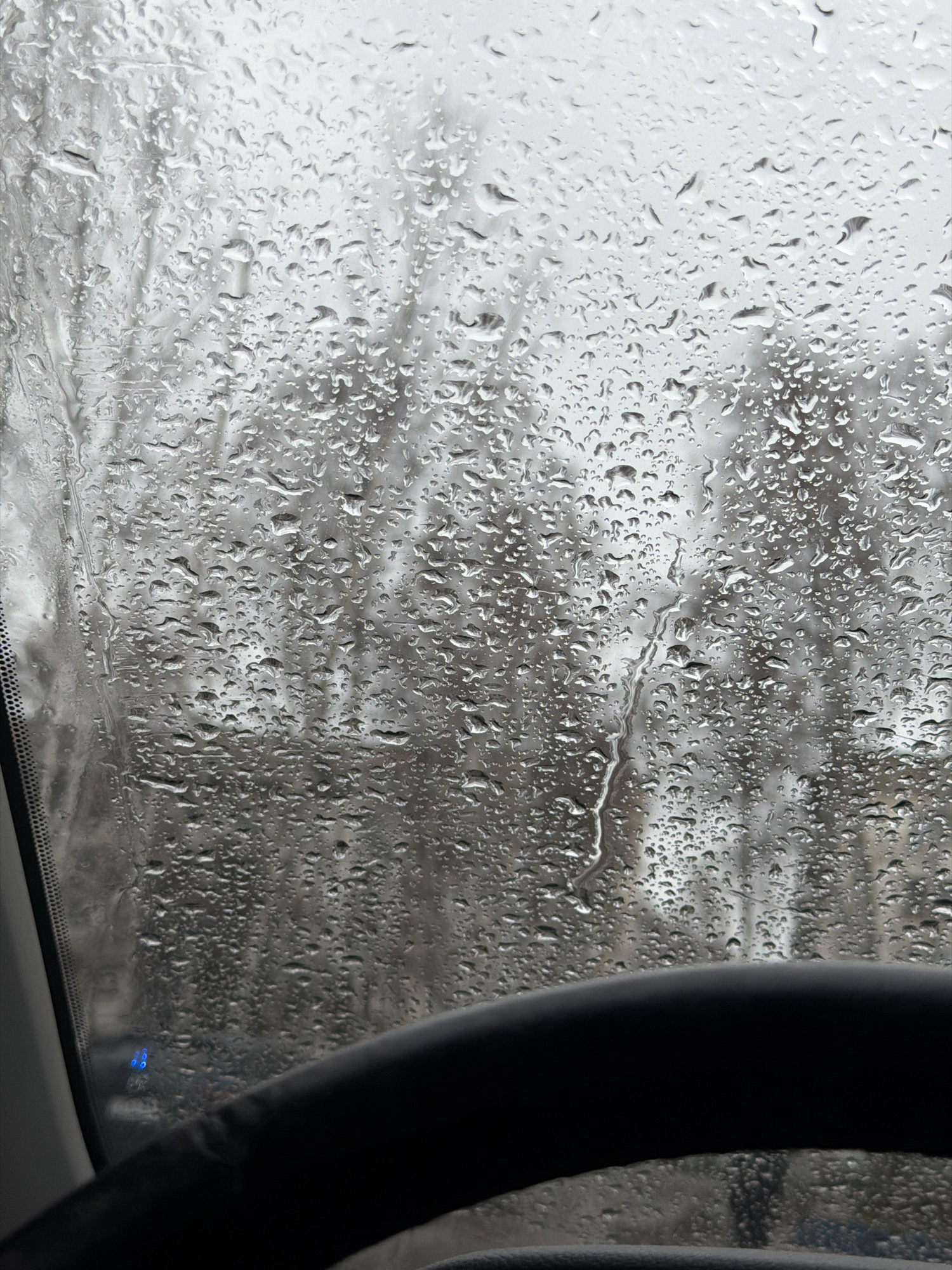 The image shows a view through a car window covered in raindrops. On the right side of the image, a portion of the car's interior, possibly the steering wheel, is visible. The windshield has accumulat…read more