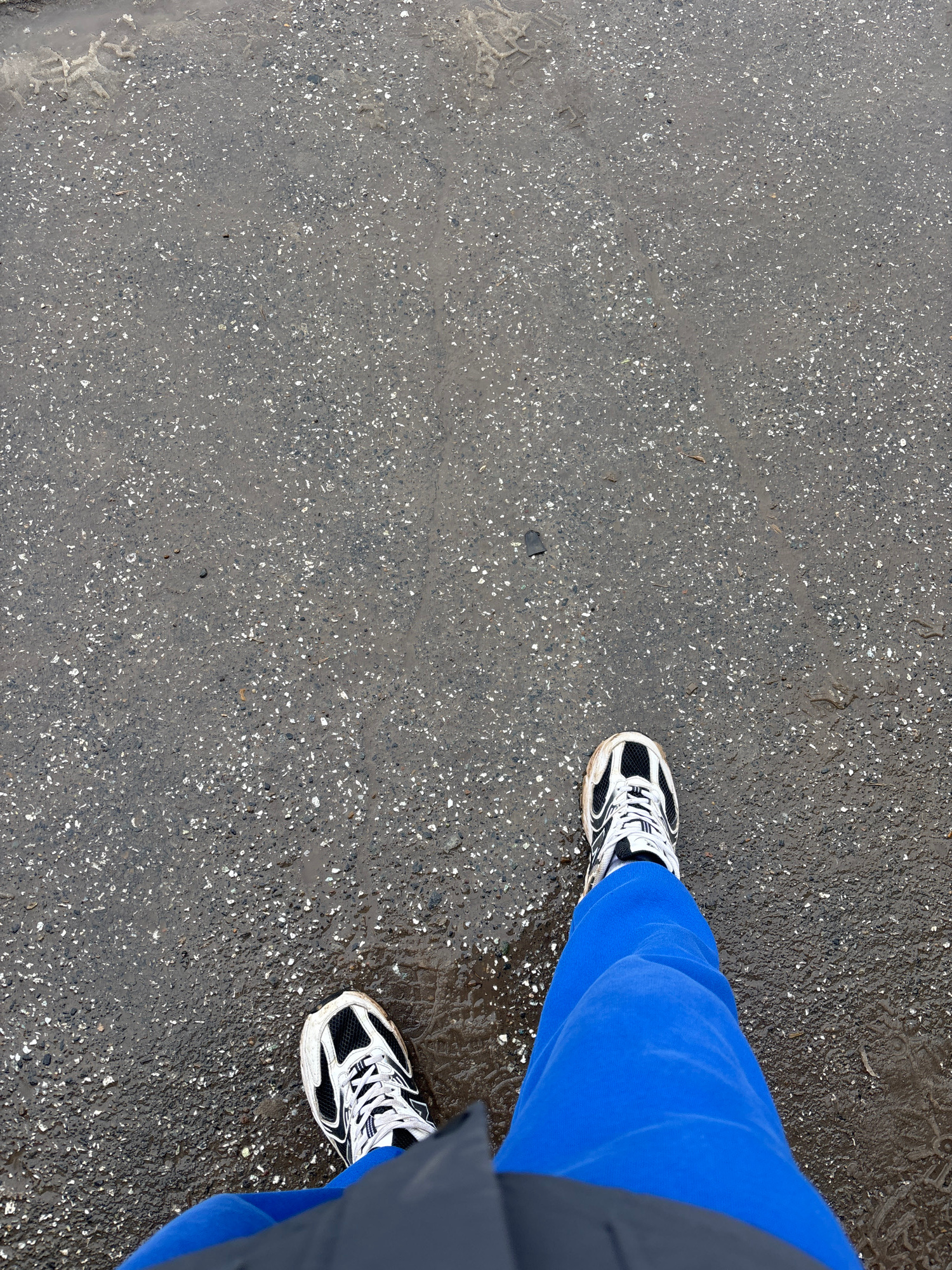 An eye-level shot depicts a person's feet on a wet asphalt surface. The person is wearing blue sweatpants and black and white running shoes. The asphalt is speckled with small white stones, indicating…read more