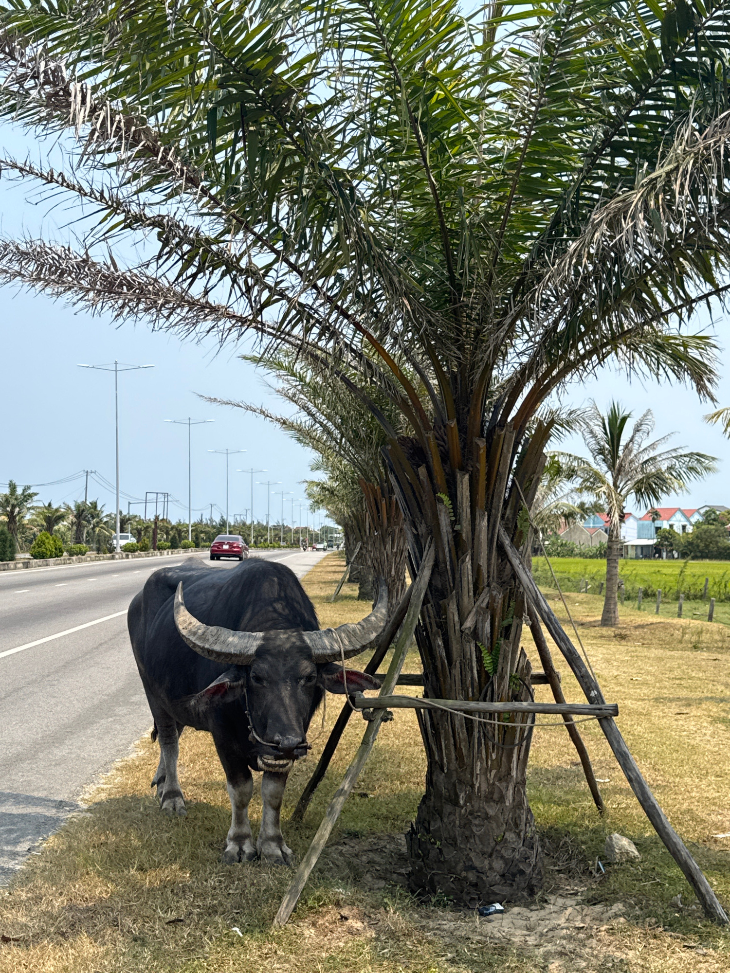 The image captures a roadside scene in Da Nang, Vietnam, featuring a large water buffalo tethered next to a paved road lined with palm trees. In the immediate foreground, a robust palm tree with abund…read more