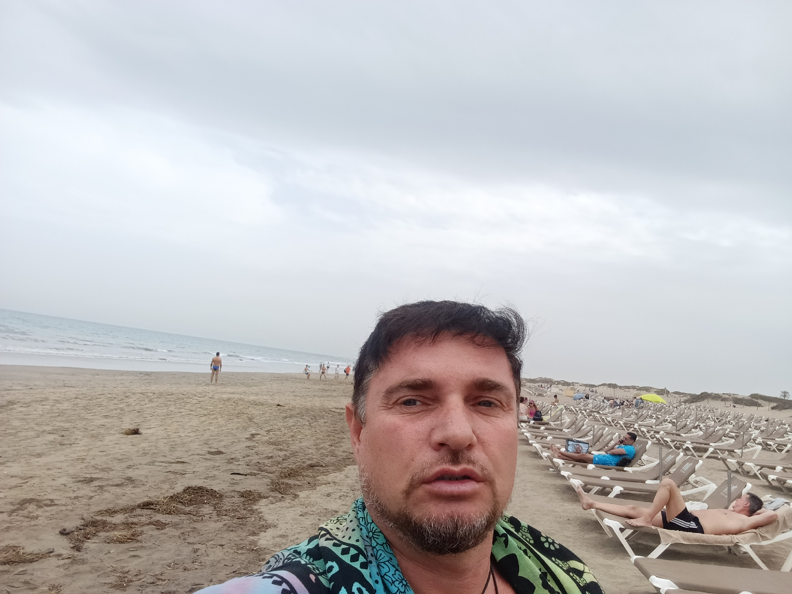 The image is a selfie taken on the beach in Maspalomas, San Bartolomé de Tirajana, Spain. The camera is held by a man with short dark hair, a salt-and-pepper beard, and a patterned shirt. Behind him i…read more