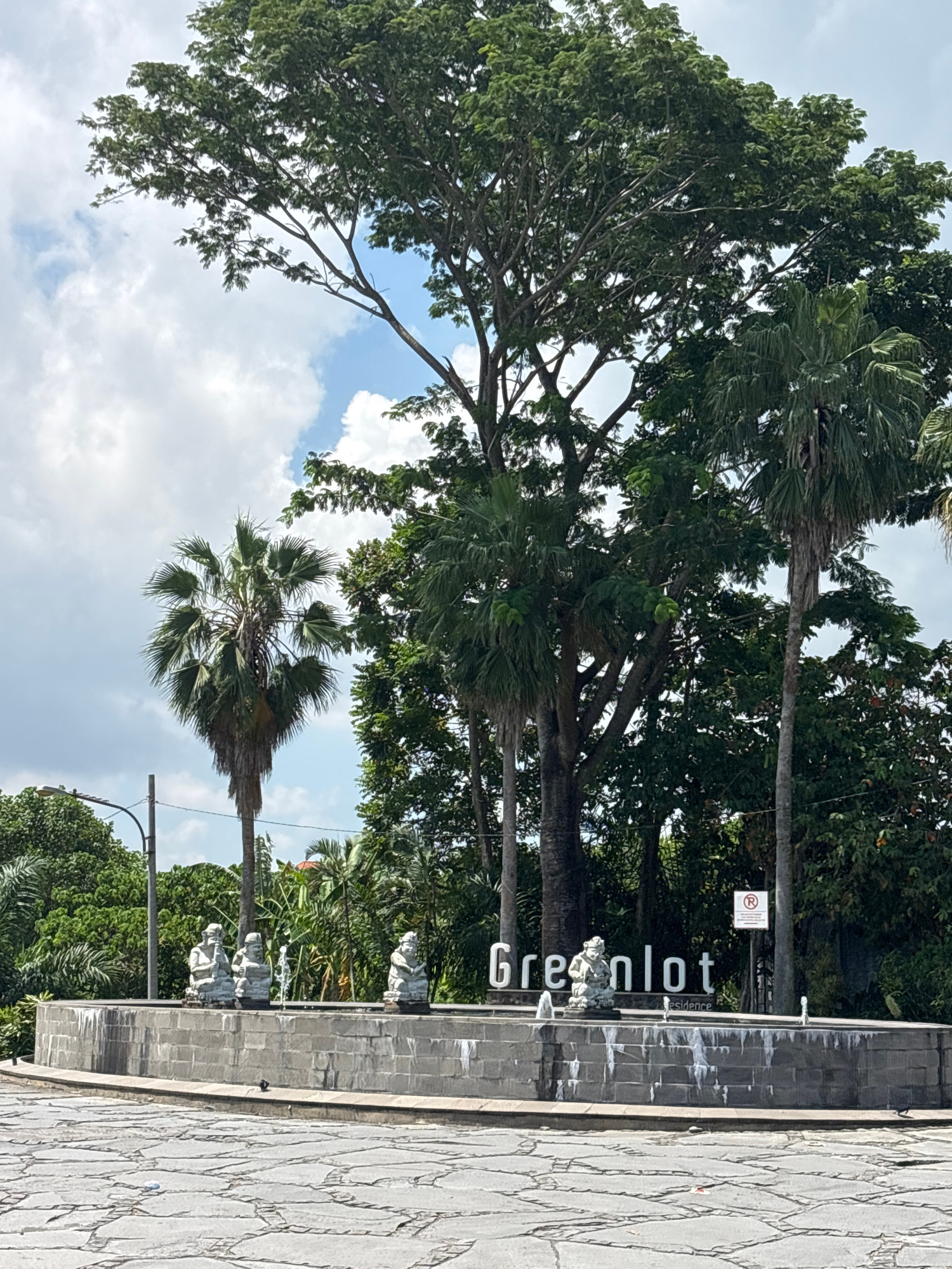 The image shows a view of the Greenlot Residence sign in Mengwi, Indonesia. The sign, constructed from grey stone, features the name "Greenlot residence" vertically arranged with white lettering. Therβ¦read more