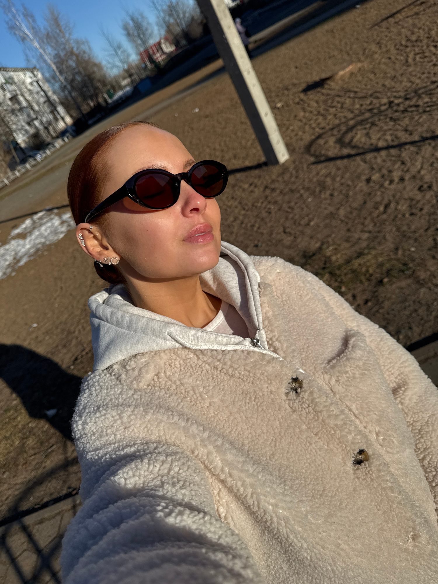 A woman with fair skin and auburn hair pulled back is looking upwards while wearing sunglasses, a white hoodie, and a light-colored fleece jacket. She has multiple earrings in her left ear. The photo…read more