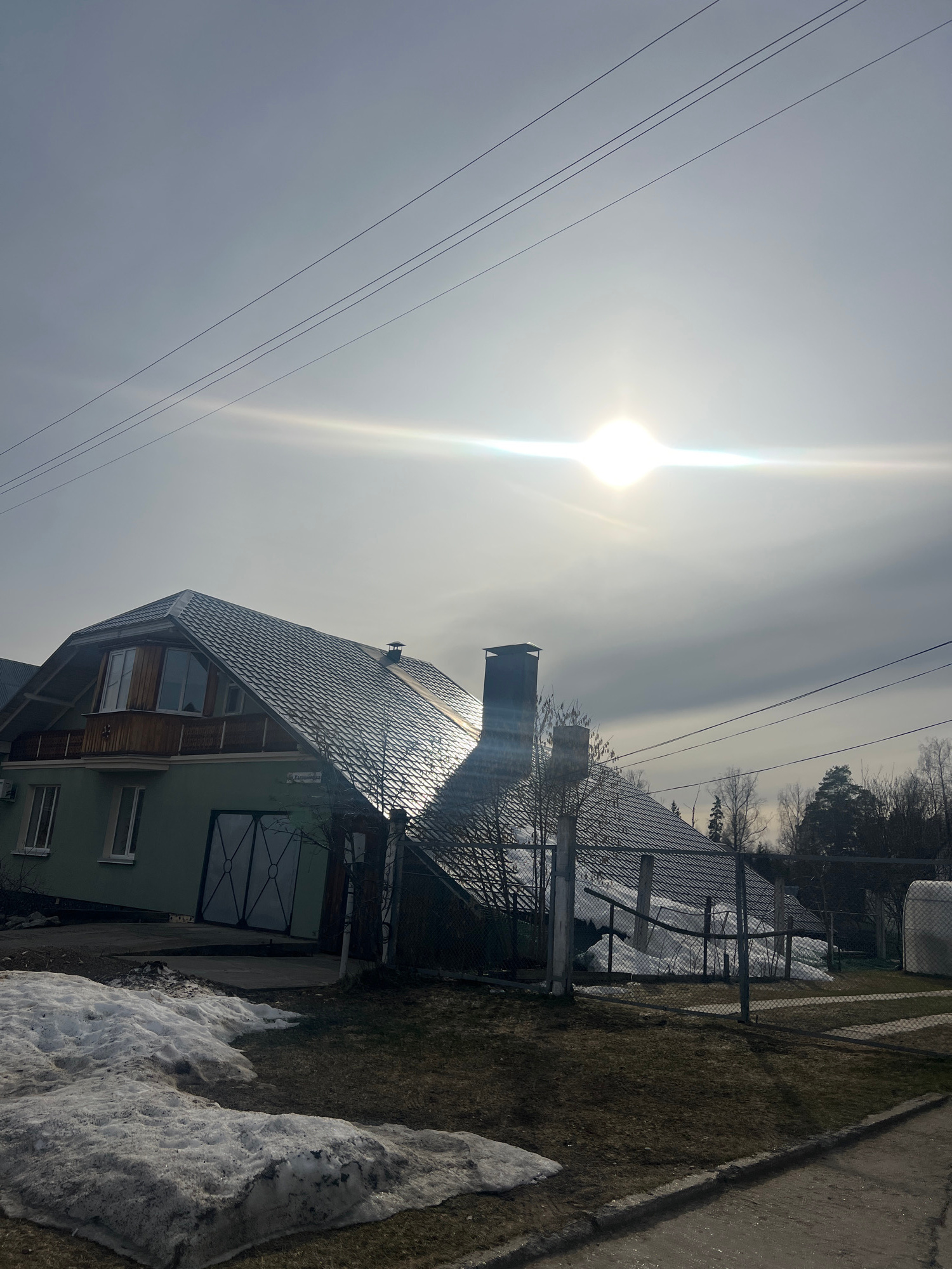 The image depicts a residential scene, potentially in a suburban or rural area. A two-story house dominates the view, featuring a dark gray tiled roof, a chimney, and light green exterior walls with d…read more