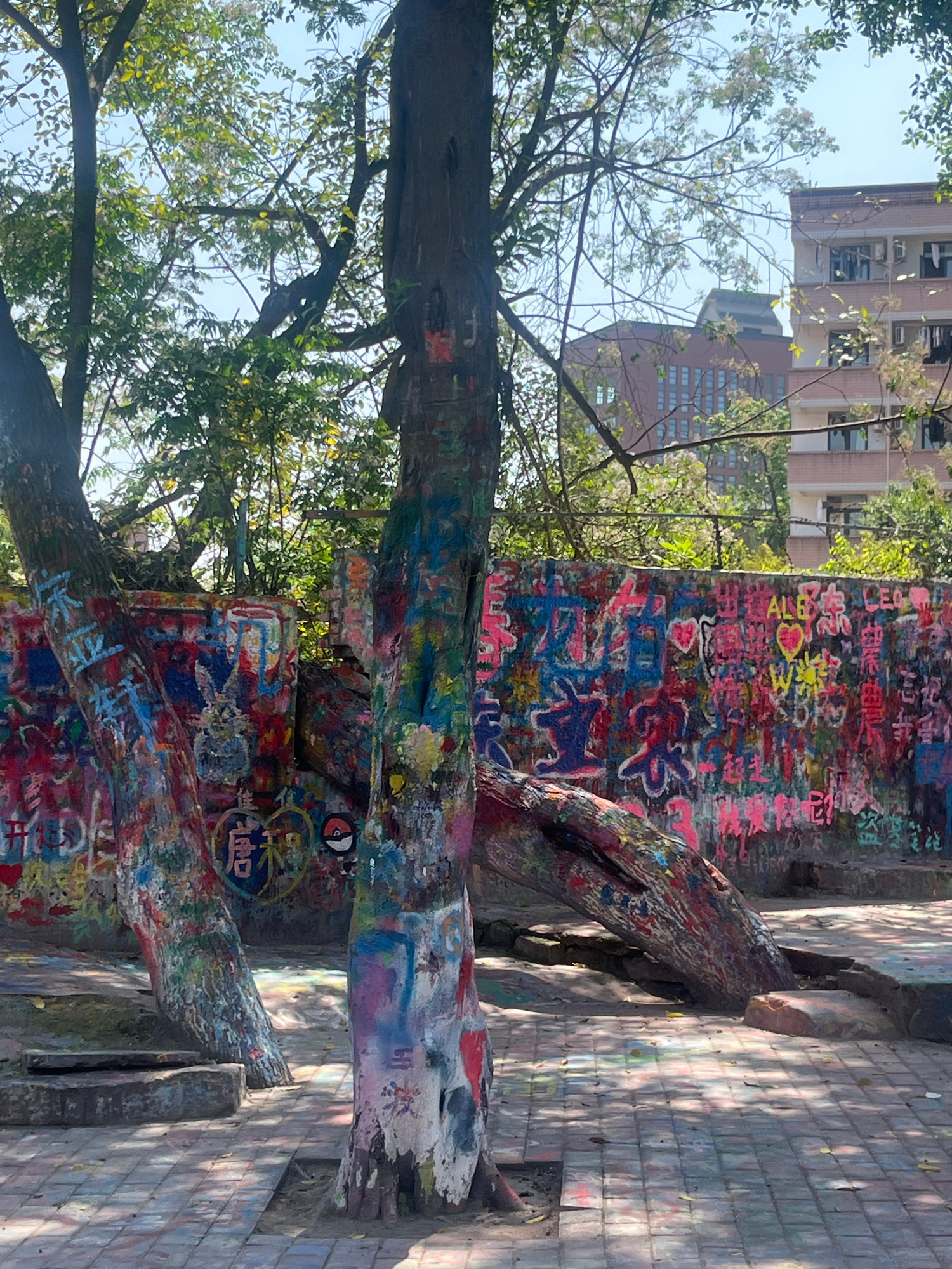 The image shows a tree covered in colorful graffiti in the city of Jiulongpo District, China. The tree is positioned near a graffiti-covered wall and a brick walkway. Buildings are visible in the back…read more