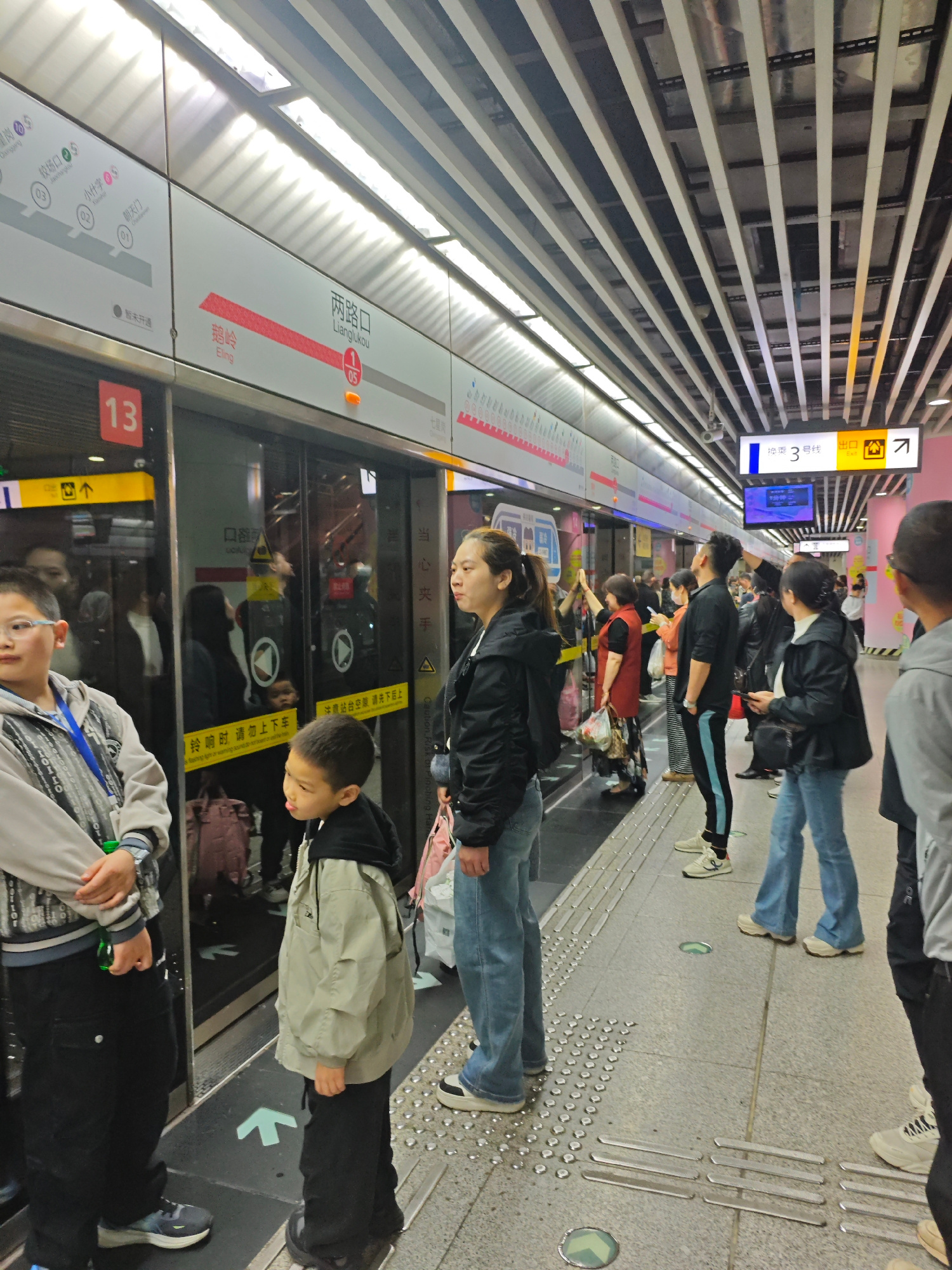 The image shows a subway platform in Yuzhong District, China. Several people are waiting near the subway doors. The doors are marked with the number "13" and have signage for "Lianglukou" station, ind…read more