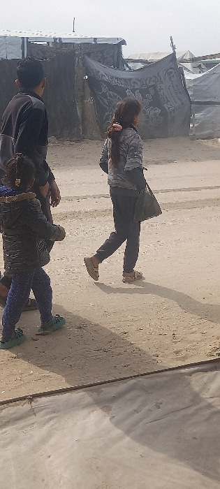 A group of people stand in an outdoor area. A young woman with long hair, wearing a gray patterned jacket and dark pants, walks past temporary dwellings. Another person walks ahead with a dark jacket…read more