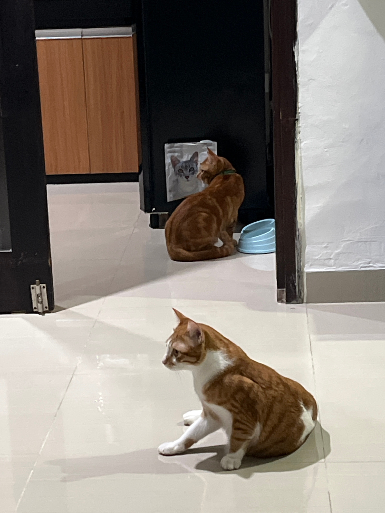 The image shows two domestic shorthair cats in an indoor setting. One is lying curled up under a dark shelf near a blue bowl and a picture with a cat on it. The other is standing on a tiled floor. Theβ¦read more
