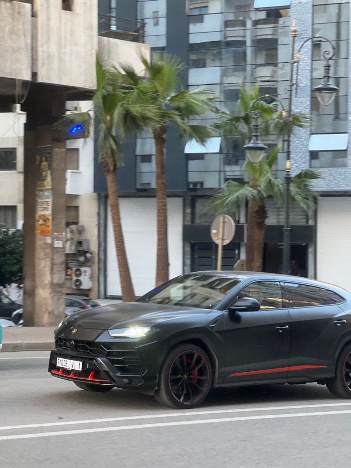 A matte black Lamborghini Urus SUV, featuring red accents on its lower front bumper and side skirts, with black wheels and red brake calipers, is captured in motion on a multi-lane paved road. Its heaβ¦read more