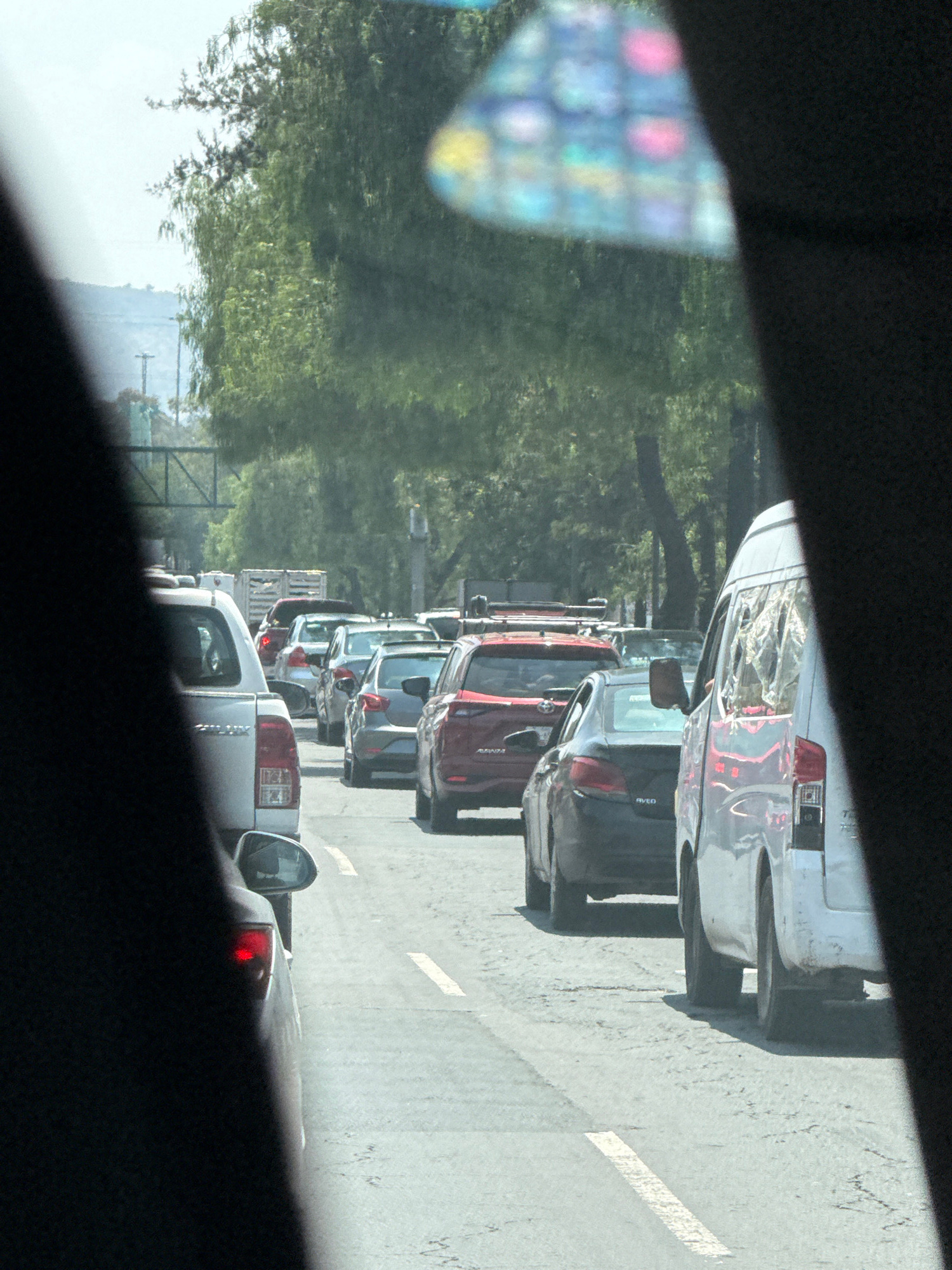 The image shows a line of cars in traffic, viewed from inside another vehicle. The cars are mostly light-colored SUVs and trucks. A white dividing line is visible on the asphalt road. Trees line the s…read more