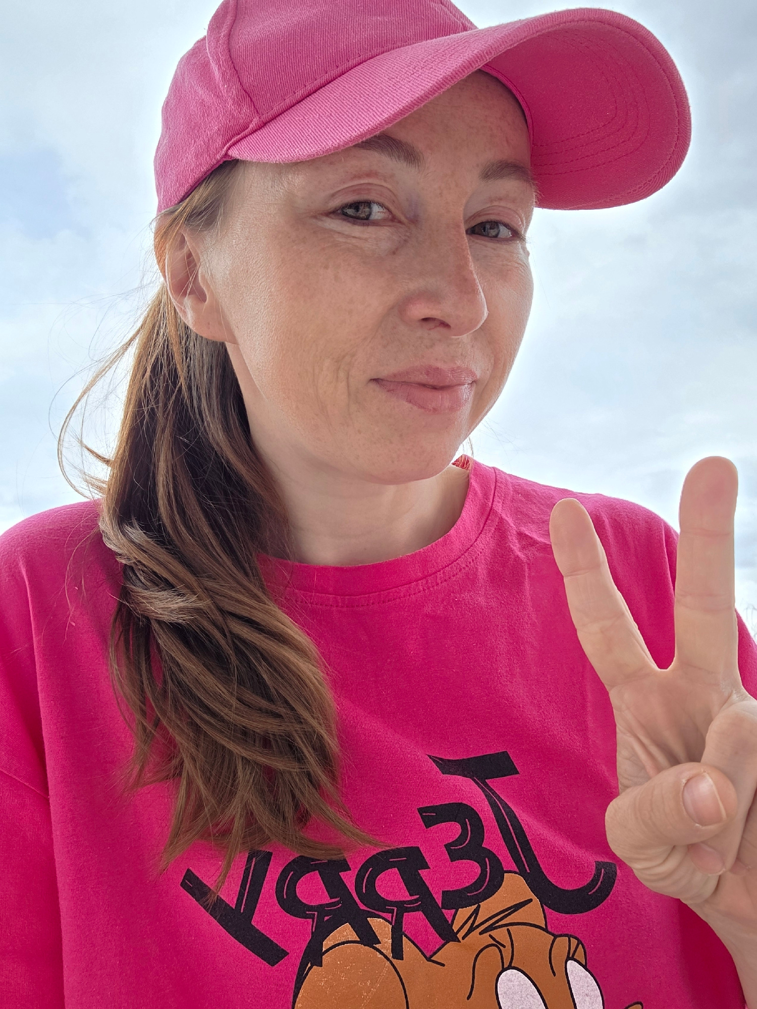 A low-angle selfie captures a person from the chest up, set against an overcast sky. The subject, likely a woman, wears a bright pink baseball cap and a matching pink t-shirt. Her brown hair frames heβ¦read more