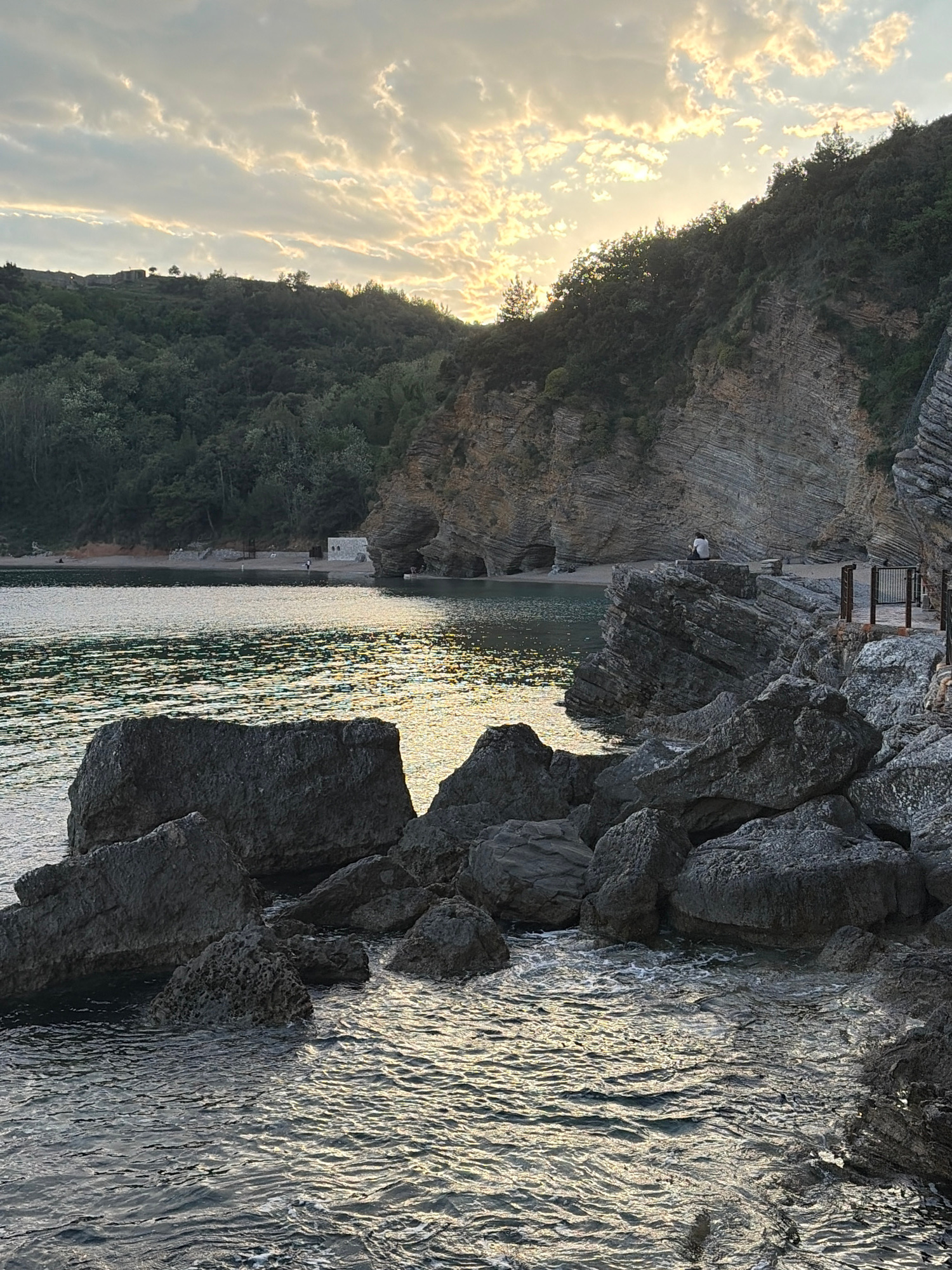 The image shows a coastal view in Budva, Montenegro, captured during daytime under a partly cloudy sky with sunlight reflecting on the water. Jagged rocks are prominently featured on the right side of…read more