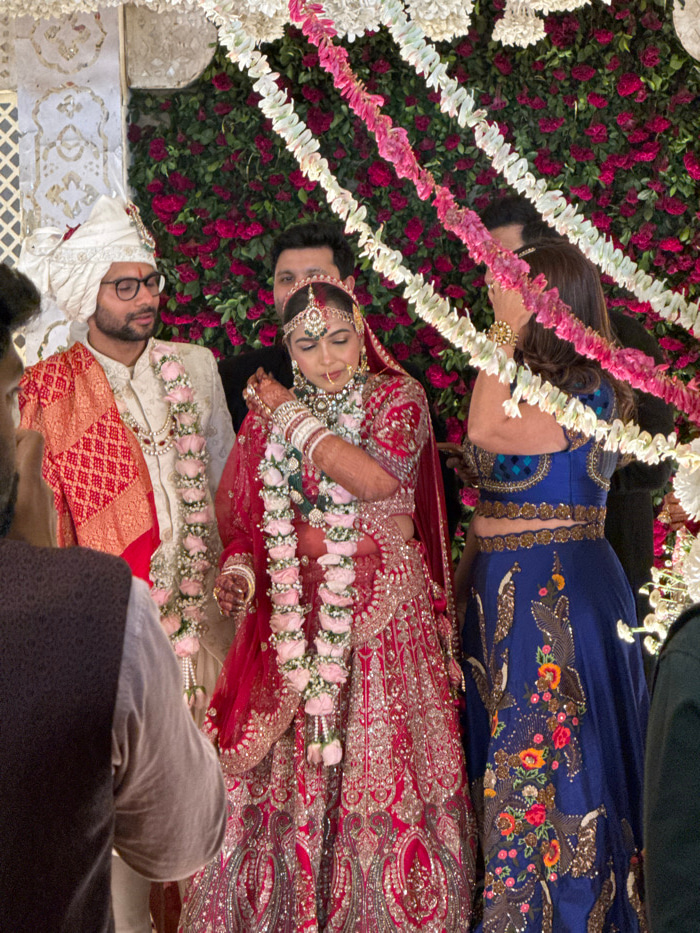 The image captures a vibrant and intimate moment from a traditional Indian wedding ceremony, seen from an elevated perspective. The scene is richly decorated with floral arrangements, featuring a back…read more