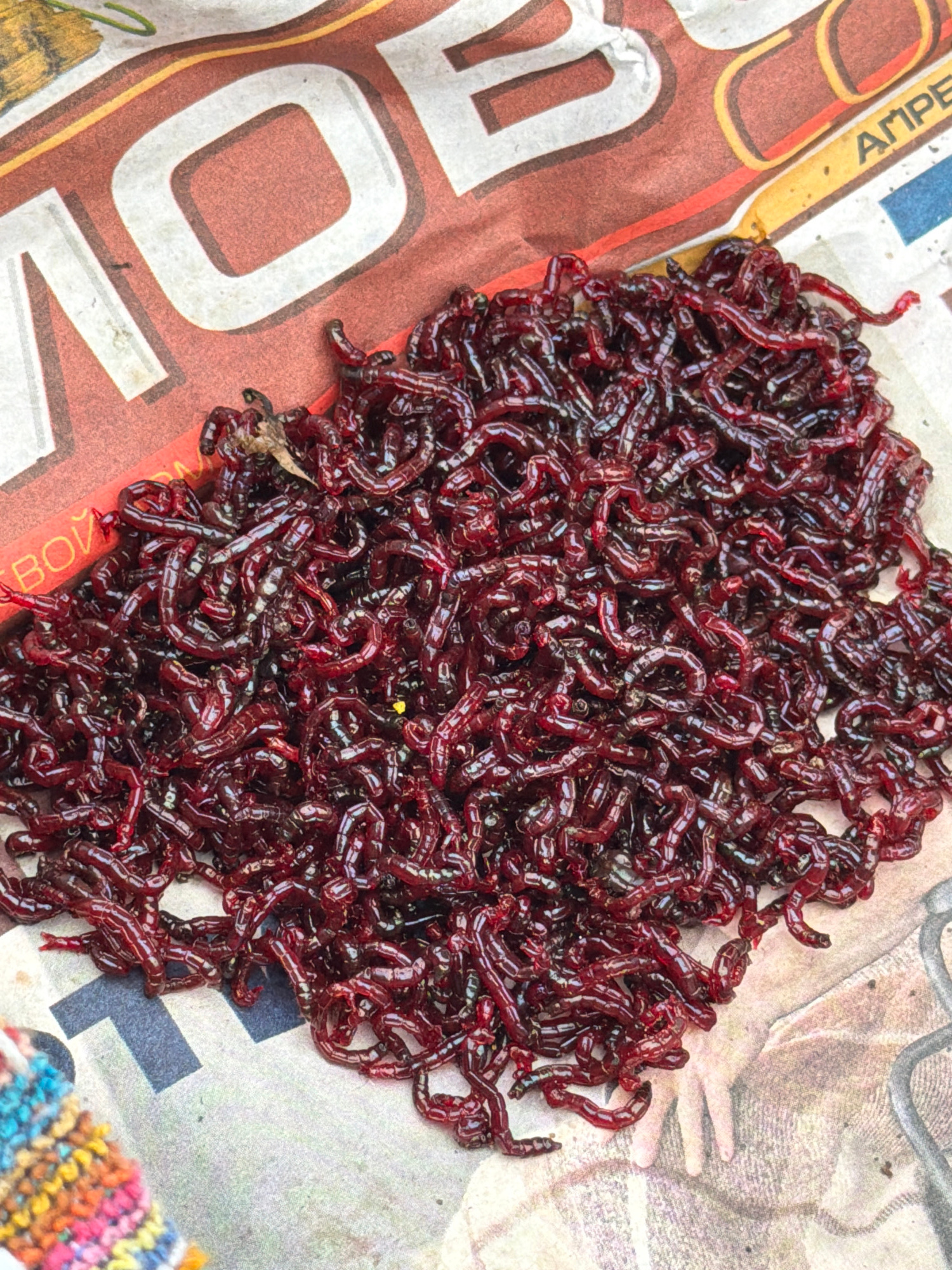 A dense pile of hundreds of red, worm-like Chironomidae midge larvae (bloodworms) lies on top of a piece of newspaper. The portion of the newspaper visible shows the large letters "O" and "B" in white…read more